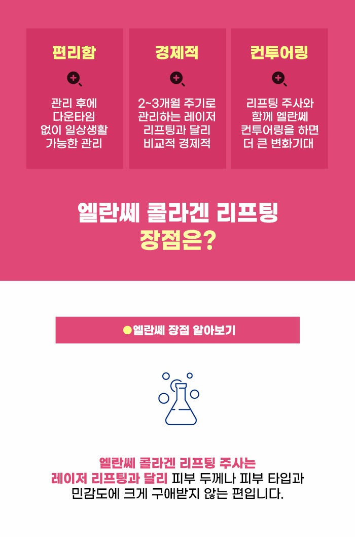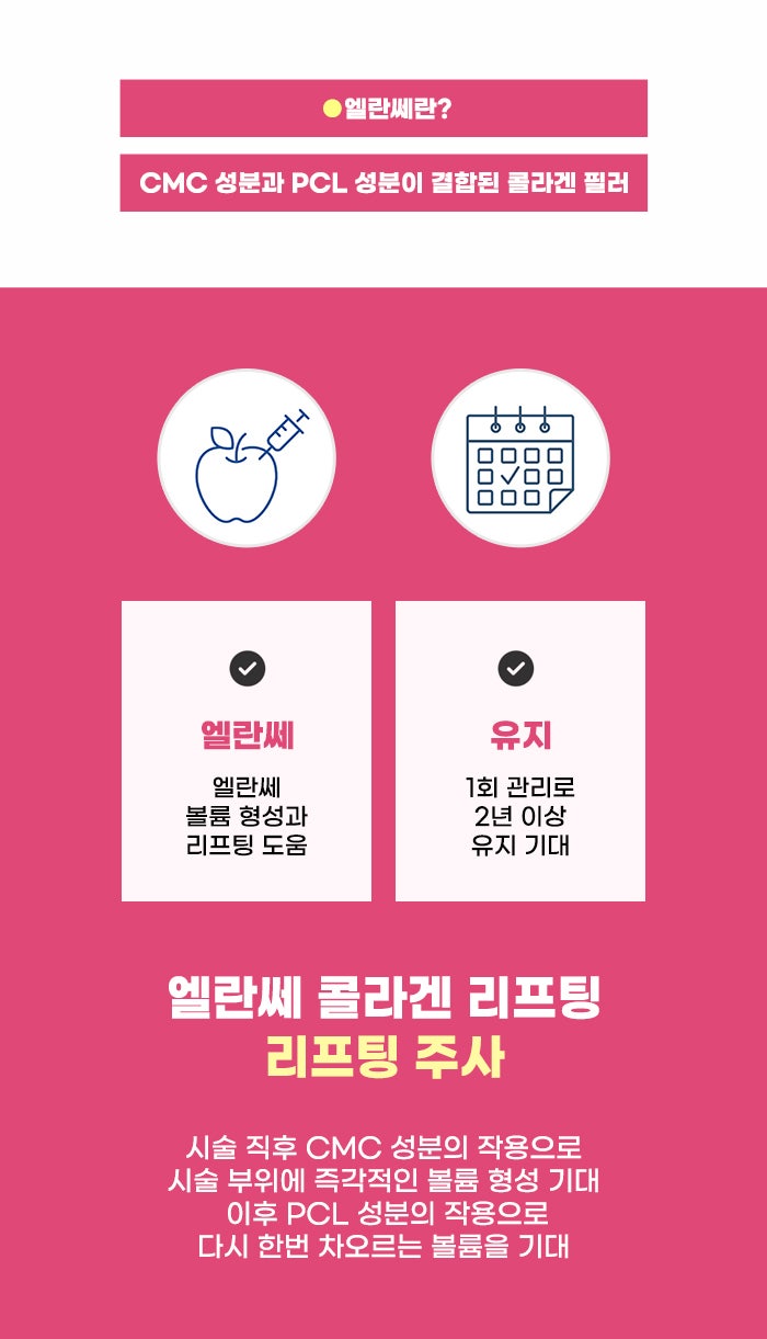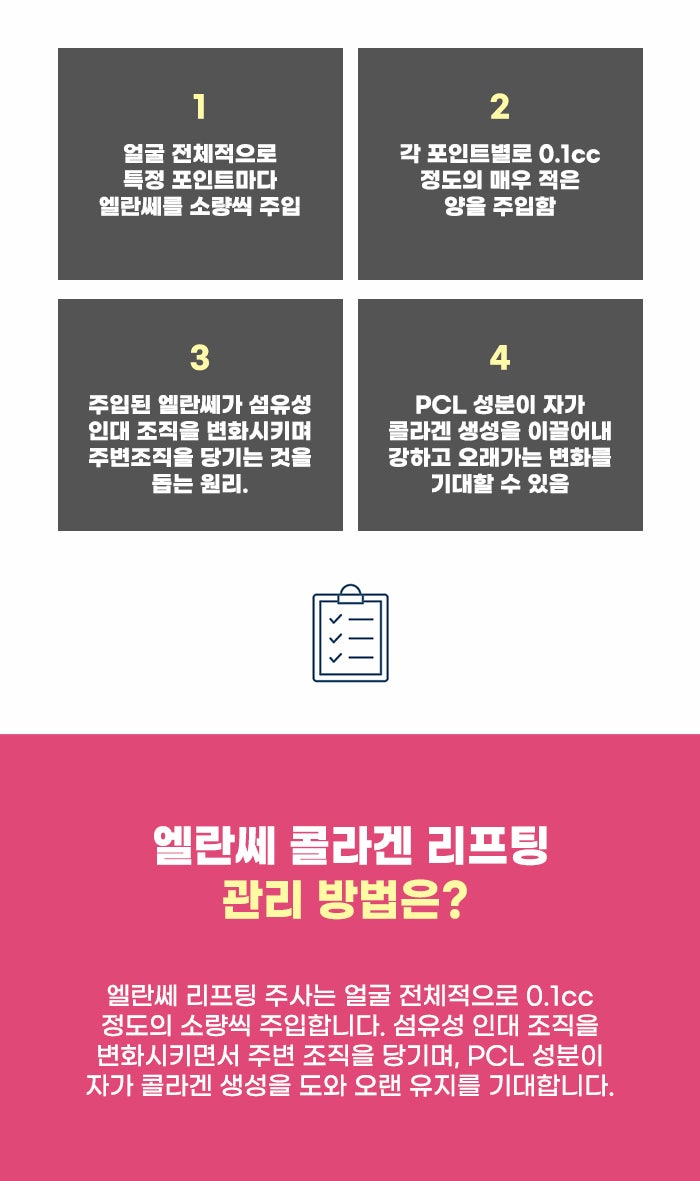 그런데 엘란쎄 관리를 찾고 있으면서 탄력 리프팅 관리를 원하는 분도 있는데요. 엘란쎄 리프팅 주사 관리는 어떤 것이고 어떤 장점이 있을까요? 엘란쎄 리프팅 주사는 포인트별로 0.1cc 정도의 작은 용량의 엘란쎄를 주입한다고 합니다. 이런 과정을 통해 섬유성 인대 조직 변화를 기대할 수 있고 주변 조직을 당기는 변화를 기대할 수도 있다고 하는데요. PCL 성분이 자가 콜라겐 생성을 끌어내는데, 이런 과정을 통해 더욱 오래가는 차이를 느낄 수도 있다고 합니다.