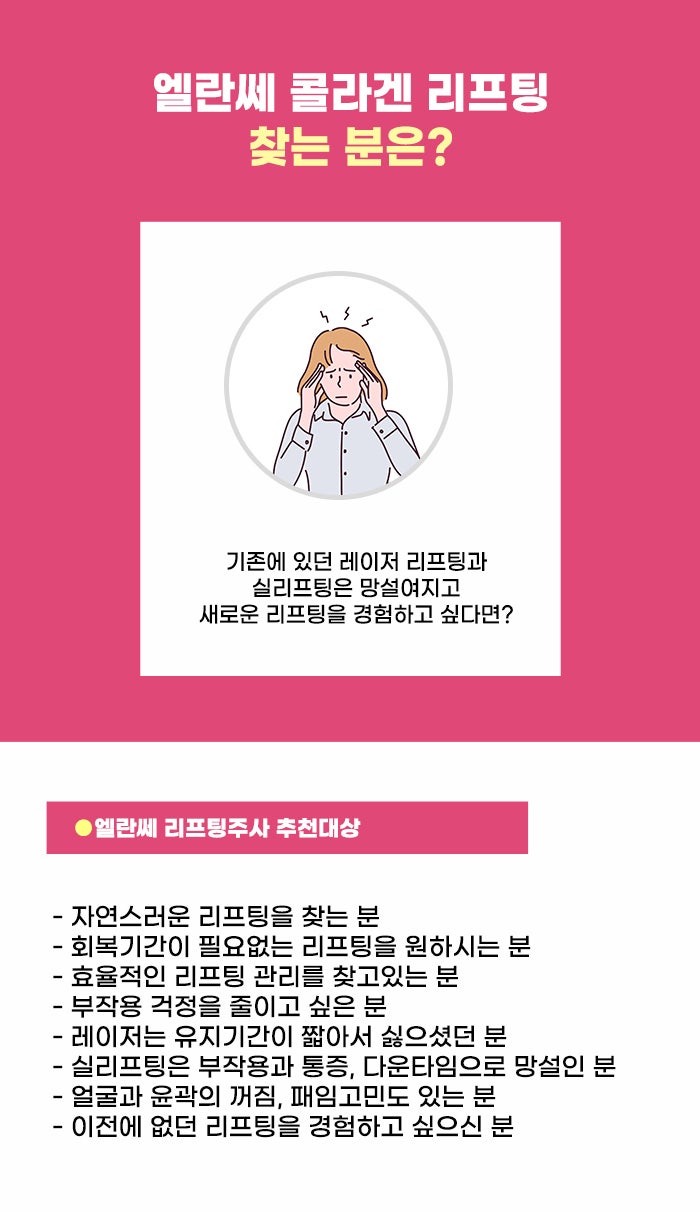 기존에 리프팅 관리를 알아보고 있었지만, 통증이 큰 관리를 원치 않았던 분, 피부 두께, 예민함 등에 크게 구애받지 않는 관리를 찾고 싶었던 분 등이 논현 엘란쎄 리프팅주사 정보를 알아보고 있는데요. 실리프팅이나 거상 같은 방법의 경우에도 수술적 방법을 통해 리프팅 변화를 느낄 수도 있지만 통증도 있고 아무래도 회복 기간이 필요해야 했습니다.