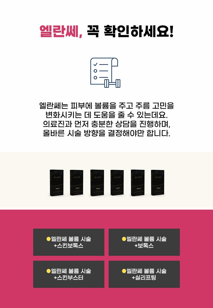 엘란쎄는 콜라겐 필러 관리라고도 불리는데요. PCL 성분과 CMC 겔 캐리어 성분을 이용한다고 합니다. 주사 관리이다 보니 간편하게 진행할 수도 있다는 장점이 있는데요. 관리 부위에 따라서 관리 시간은 달라질 수 있지만 간단하게 10분 내외로 진행할 수도 있다고 합니다. 엘란쎄 관리의 경우 볼륨을 더하고 싶은 부분에 탄탄한 볼륨 형성을 기대할 수 있다는 장점이 있다고 합니다.