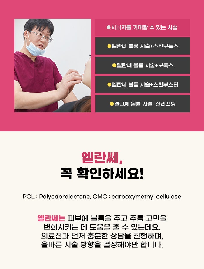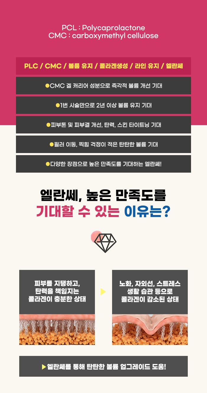 보통의 필러 관리와 다른 점이 있는 엘란쎄는, 다양한 장점을 갖고 있다 보니 이 관리를 찾는 분도 늘어나는 것 같습니다. PCL 성분, 그리고 CMC 겔 캐리어 성분을 이용하는 게 엘란쎄라고 하는데요, 피부 속 콜라겐이 소실되고, 꺼짐, 패임, 밋밋한 얼굴 등의 고민이 생겼을 때 엘란쎄 관리를 찾기도 합니다. 밋밋하고 꺼진 라인, 움푹 들어간 라인에 볼륨 형성을 즉각적으로 기대할 수 있습니다.
