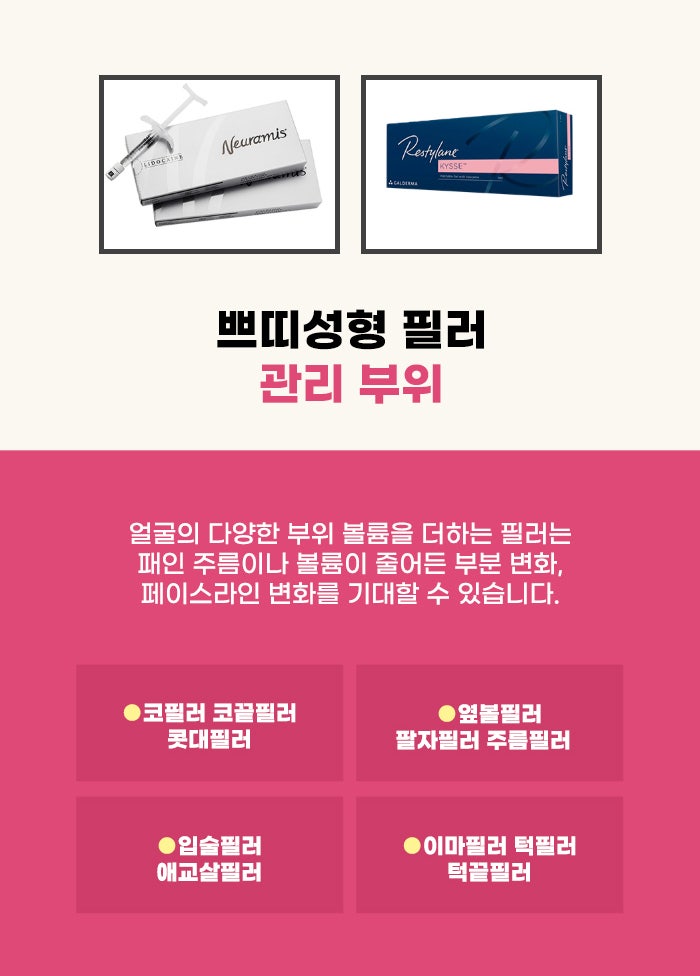 필러 관리의 경우, 히알루론산 성분 등, 여러 필러제를 이용하게 되는데요, 코 필러, 옆볼 필러, 턱끝 필러, 이마 필러, 애교살 필러, 입술 필러 등 다양한 부분에 적용할 수도 있다는 필러 관리의 특징이 있습니다. 개인에 따라서 필러 관리 시 세부적인 과정이나 결과, 부기 등은 차이가 있을 수도 있습니다.