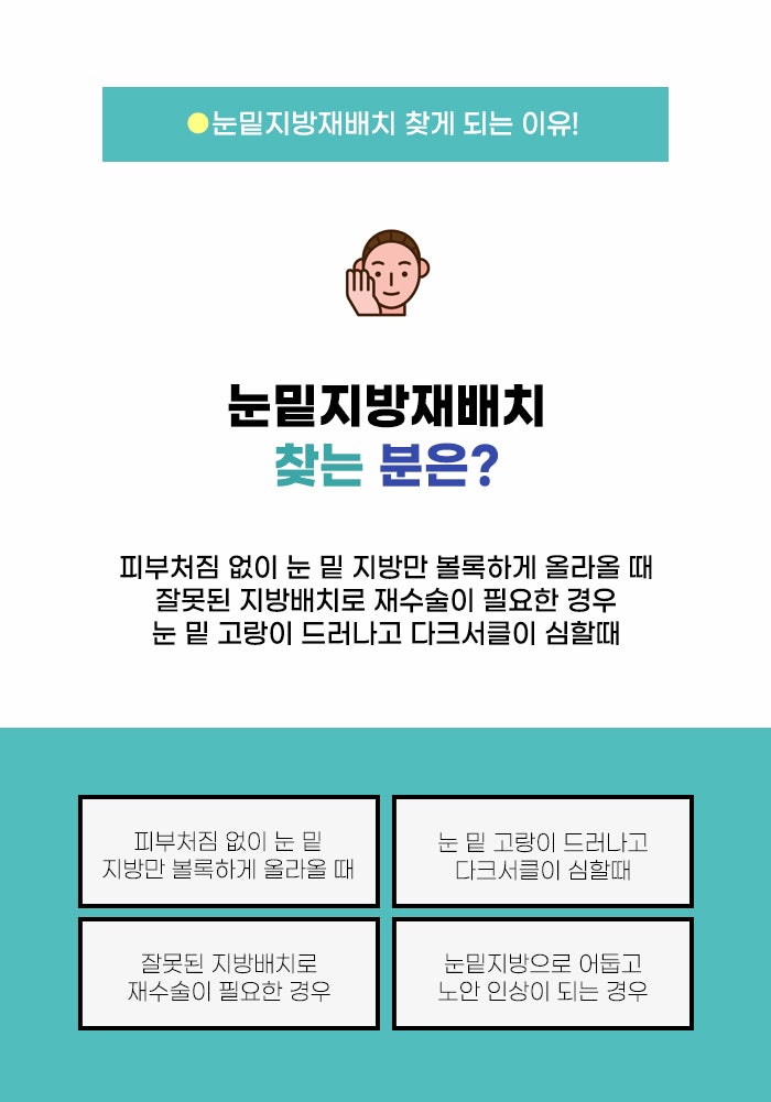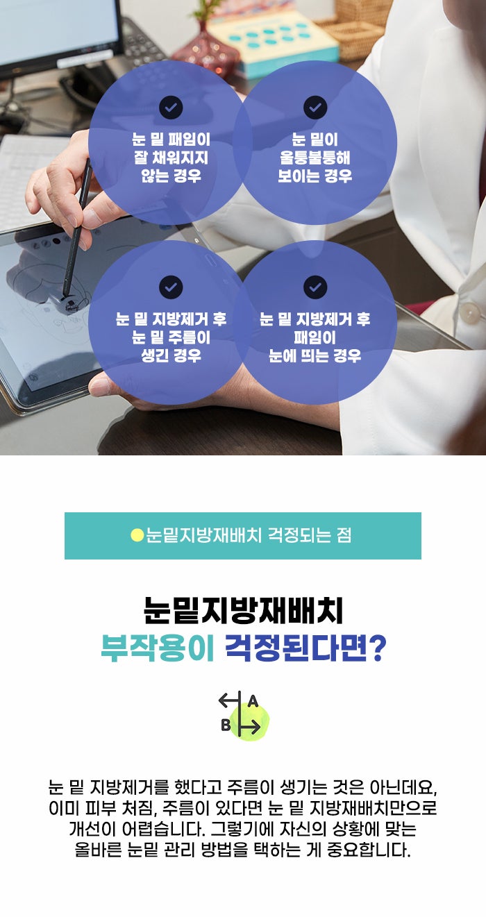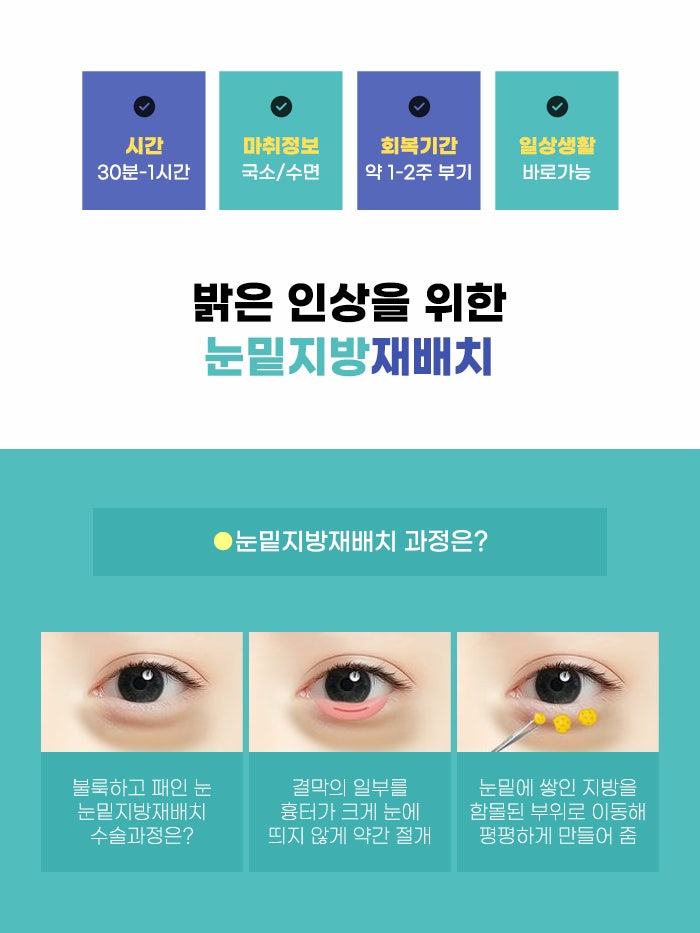 그렇기에 이런 경우 기존에 피부 처짐, 주름이 없는지 꼼꼼히 확인하고 하안검 수술 등 올바른 방법을 택하는 게 필요하겠습니다. 또한 눈 밑의 패임이 없는 상태라면 그냥 불룩한 지방을 없애는 방법만을 진행할 수도 있다고 하는데요. 이 경우에는 눈 밑 지방제거만으로 충분한지 꼼꼼히 체크하셨으면 좋겠습니다.