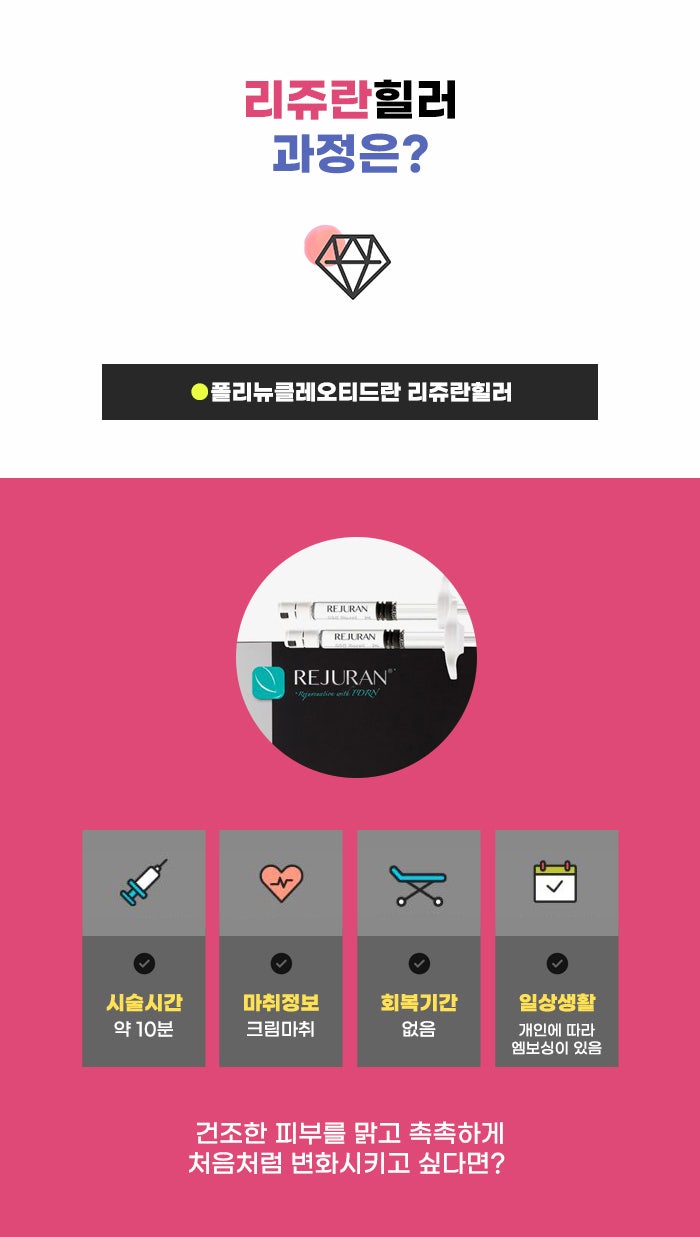 리쥬란힐러는 어두운 피부톤, 피부 속 건조함으로 고민하는 경우에도 찾는데요. 또한 자외선 노출이나 여러 이유로 노화가 진행되어 보이는 피부가 신경 쓰이는 경우에도 리쥬란힐러 과정을 찾기도 합니다. 리쥬란힐러 관리의 경우 짧은 관리 시간이 특징입니다. 긴 시간이 걸리는 관리, 그리고 피부에 너무 강한 자극과 통증이 있는 관리를 원치 않는 경우에도 강남 리쥬란힐러 손주사 찾을 수도 있습니다.