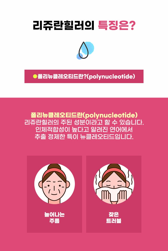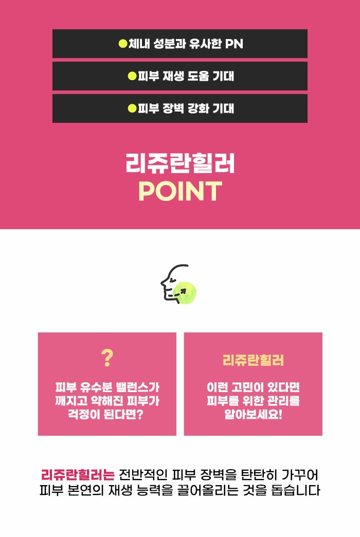 리쥬란힐러는 연어에서 추출, 정제한 특이 뉴클레오티드를 이용한다고 하는데요, 이 성분을 피부 진피로 전달시키는 과정을 통해 피부 내부의 여러 생리적 조건을 변화시키는 데 도움을 받을 수도 있다고 합니다. 특히 피부 노화가 점차 진행되면서 주름, 늘어나는 모공 같은 고민이 생길 수도 있고 세안을 자주 해도 피부 트러블로 고생하다가 자국, 예민한 피부 등의 고민이 남을 수도 있는데요, 이런 고민이 있는 경우에도 리쥬란힐러 관리를 찾기도 합니다.