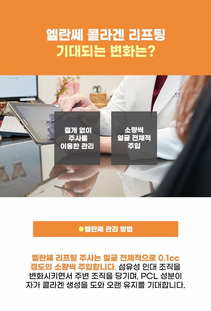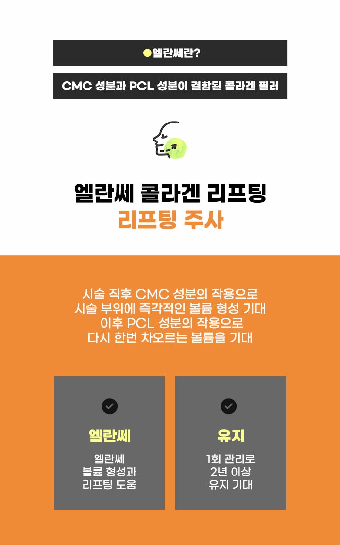 엘란쎄는 PCL 성분을 이용하며 CMC 성분도 이용하는 관리입니다. 관리 직후에는 즉각적인 볼륨 형성을 CMC 성분이 돕고, 또 PCL 성분의 작용을 통해 기간이 흐른 후 다시 한번 볼륨이 차오르는 차이를 느낄 수도 있다고 합니다. 엘란쎄 관리의 경우 유지 기간이 짧은 레이저와 다른 관리, 그리고 더 효율적이고 자연스러운 리프팅을 원하는 분도 주목하고 있는 것 같습니다.