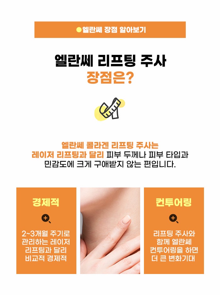엘란쎄 성분은 주입 후 섬유성 인대 조직을 변화시키는 것을 기대할 수도 있습니다. 이를 통해 주변 조직을 당기고, 자가 콜라겐 생성을 끌어내는 것도 도울 수도 있다고 합니다. 엘란쎄 관리의 경우 적은 양의 엘란쎄 성분을 주사를 이용해 주입하는 과정을 통해 진행된다고 하는데요, 각 포인트에 따라서 매우 적은 양을 주입하는데 약 0.1cc 정도의 적은 양이라고 합니다.
