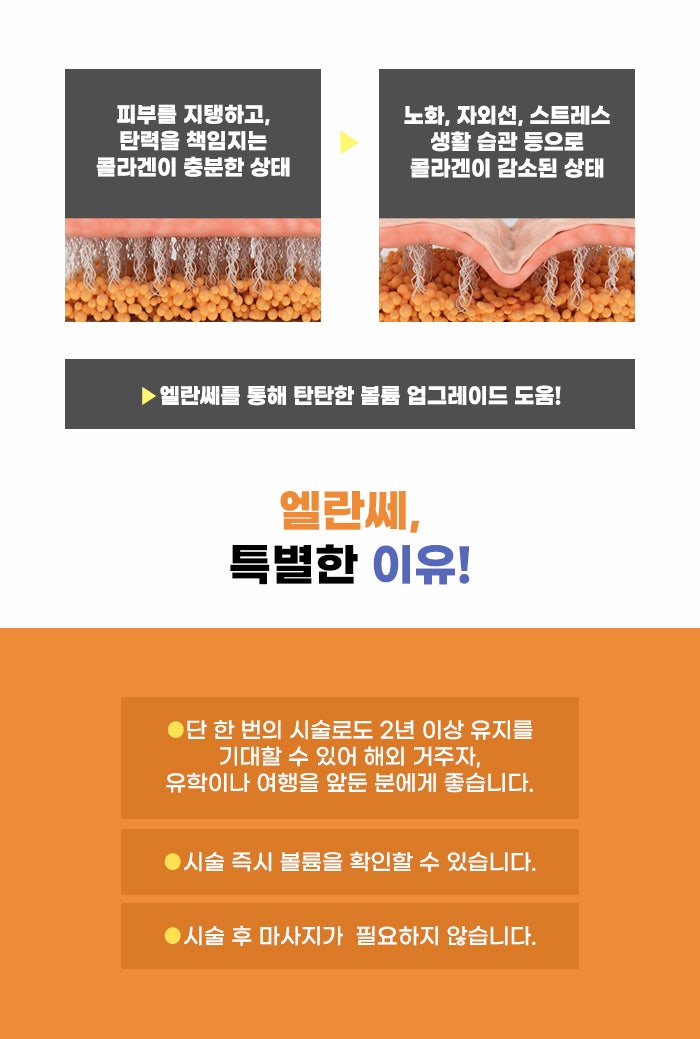 엘란쎄의 경우 보통 히알루론산 관련 성분을 이용하는 경우가 많은 보통 필러와 다른 차이점이 있는데요. 한 번의 관리로도 2년 이상 유지를 기대할 수도 있다는 점 등 여러 장점을 갖고 있다고 합니다. 아무래도 관리를 자주 받는 경우 반복 관리에 따르는 비용도 부담이지만, 시간의 소요에 따르는 부담도 생각하지 않을 수 없습니다.