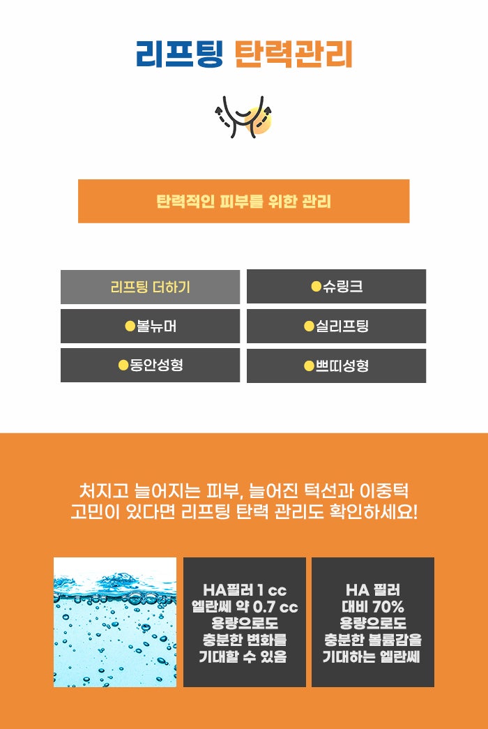 특정 부분에 볼륨을 더하기 위한 목적으로 엘란쎄 관리를 찾기도 하지만, 얼굴 전체적인 리프팅, 탄력, 볼륨감을 위해서도 논현 리프팅주사 정보 찾아보기도 하는데요. 엘란쎄를 약 0.1cc 정도 소량씩 주입하는 엘란쎄 리프팅은 섬유성 인대 조직을 변화시키면서 주변 조직을 당기는 원리를 이용한다고 합니다.