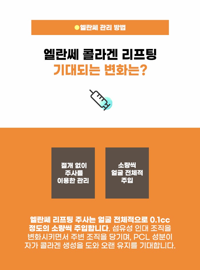 또 피부밑에 실을 삽입해 당겨주는 실리프팅도 많이 알려진 관리인데요. 실리프팅만의 장점이 있지만 강한 통증, 그리고 관리 후 주의해야 하는 점이나 다운타임 등에 대한 걱정도 있을 수 있습니다. 하지만 엘란쎄의 경우 통증에 대한 부담이 적고 시술 후에도 통증, 부기, 회복 기간 등에 대한 걱정이 적은 편일 수도 있다고 합니다.
