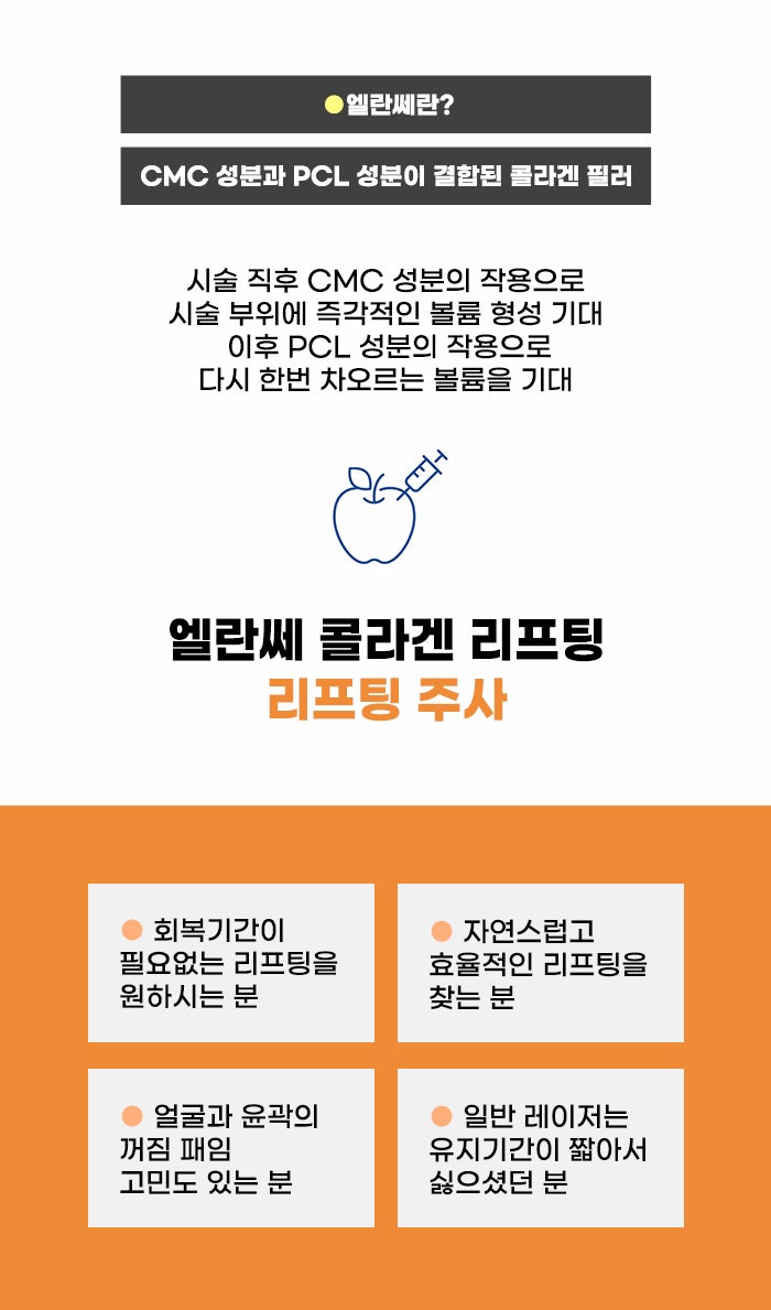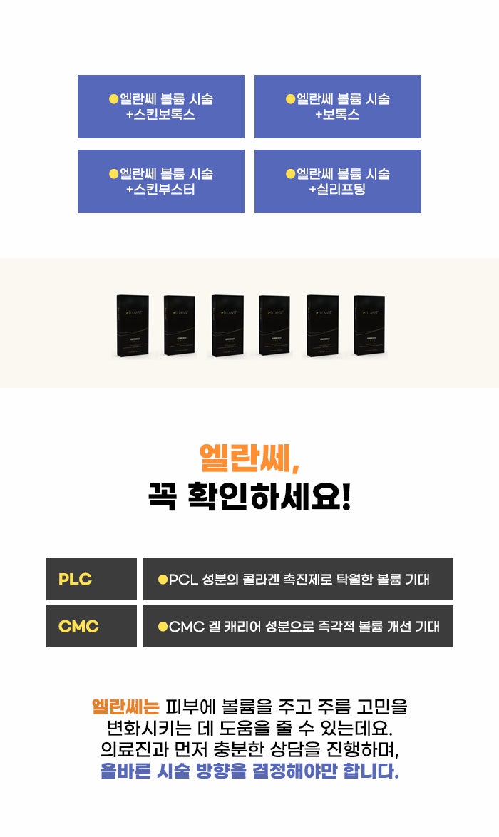 엘란쎄는 PCL 성분을 이용하는 관리이면서 CMC 겔 캐리어 성분을 이용하는 관리라고 하는데요. 즉각적인 볼륨 변화를 기대할 수 있는 성분과, 시간이 지난 후 볼륨을 차오르게 할 수 있도록 겔 캐리어 성분을 함께 이용하는 방식이다 보니 빠른 볼륨 형성 그리고 시간이 지나도 오랜 유지력을 기대할 수도 있다고 합니다. 엘란쎄는 프리미엄 필러 관리로 많이 알려져 있는 것 같은데요.
