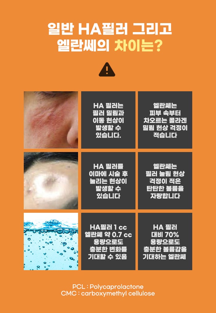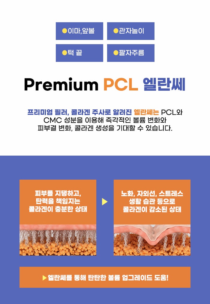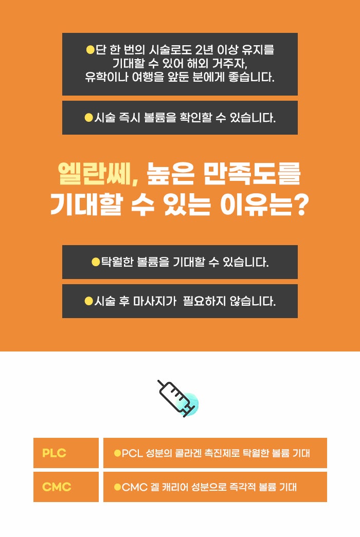 엘란쎄는 PCL 성분을 이용하고, CMC 성분을 통해서도 변화를 만든다고 하는데요, PCL 성분은 콜라겐 촉진제의 특징을 갖고 있다고 합니다. CMC 겔 캐리어 성분을 통해 즉각적으로 관리 부위에 볼륨을 형성하는 것을 기대할 수 있다고 하는데요, 그리고 자가 콜라겐 합성을 유도하면서 더욱 오래 가는 엘란쎄 필러 관리를 기대할 수도 있다고 합니다.