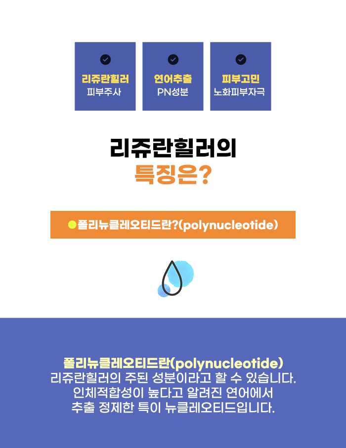 이런 경우 단순히 수분 공급만을 하는 게 아니라 무너진 피부 장벽을 복원하고, 피부에 부족한 것을 알맞게 채워주는 관리, 약해진 피부를 돕는 방법이 필요할 수도 있습니다. 이런 지친 피부에 대한 고민을 가졌을 때 리쥬란힐러는 폴리뉴클레오티드 성분을 이용해 피부를 돕는다고 하는데요. 이 폴리뉴클레오티드 성분은 리쥬란힐러의 주된 성분이라고 하며, 열에 안정적인 성분이라고 알려져 있습니다.