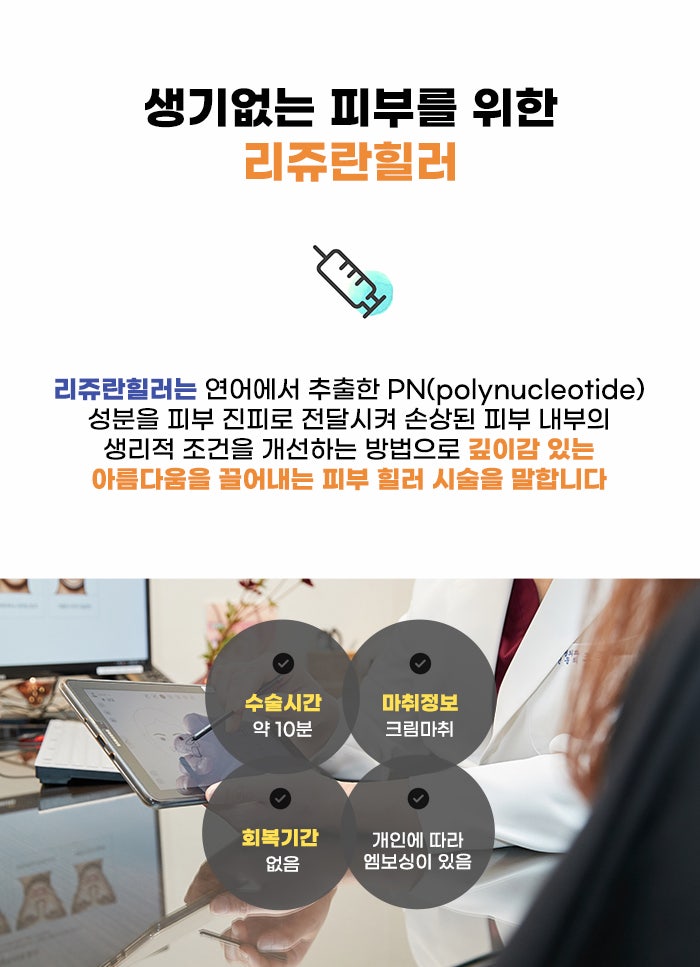 인체 적합성이 높다고 알려진 연어에서 추출하고 정제해 사용하는 특이 뉴클레오티드 성분을 이용하는 리쥬란힐러는 피부 재생 능력 활성화를 기대할 수도 있다고 하는데요, 기존에 갖고 있던 피부 고민을 변화시키고 피부 구조를 복원하는 데 도움을 기대할 수도 있다고 합니다. 그렇다 보니 약해진 피부, 예민해진 피부 고민이 있던 분이나,