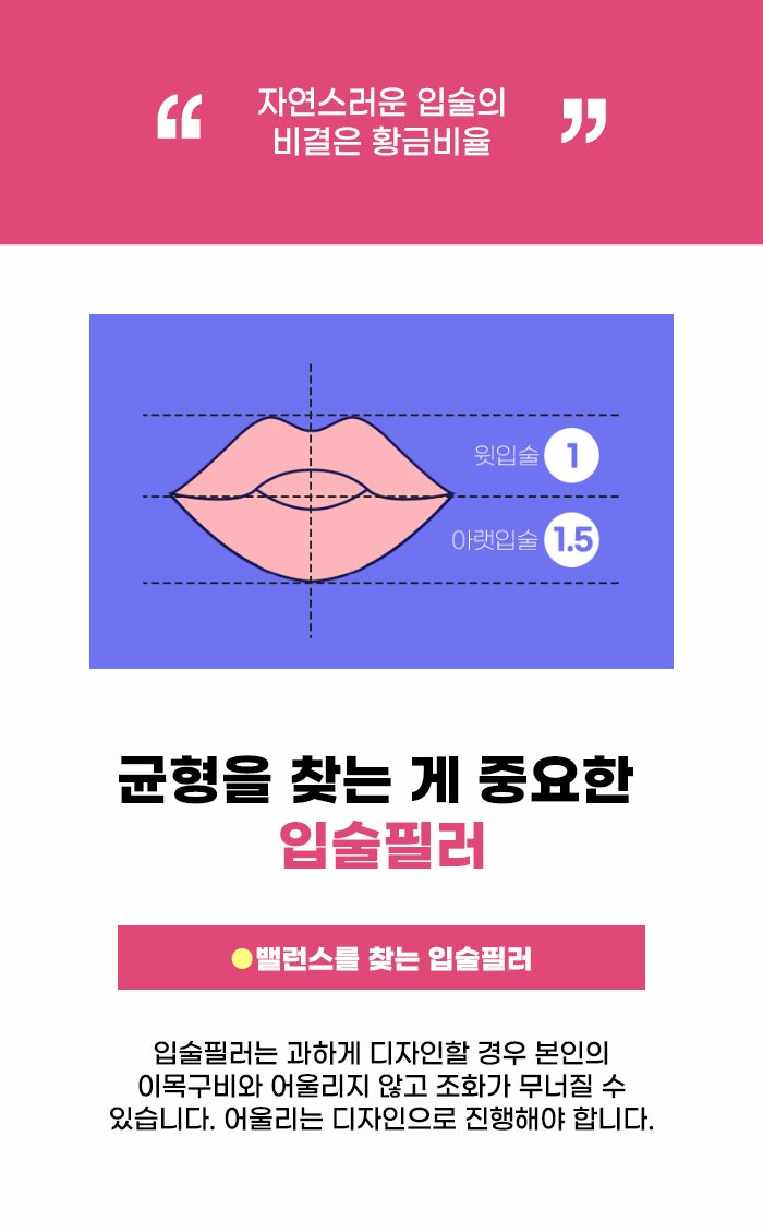 입술필러는 균형이 중요하다고 하는데요, 요즘은 도톰한 입술을 예쁘다고 생각하는 분도 많고, 트렌디한 이미지를 위해 도톰한 입술라인을 갖고 싶어서 강남역 입술필러 관리를 찾기도 합니다. 그런데 모든 사람에게 다 도톰한 입술이 어울리는 것은 아닙니다. 무조건 과하게 디자인할 경우 본연의 이목구비와 어울리지 않을 수도 있습니다. 그렇기에 조화로운 관리를 하는 게 중요하다고 합니다.