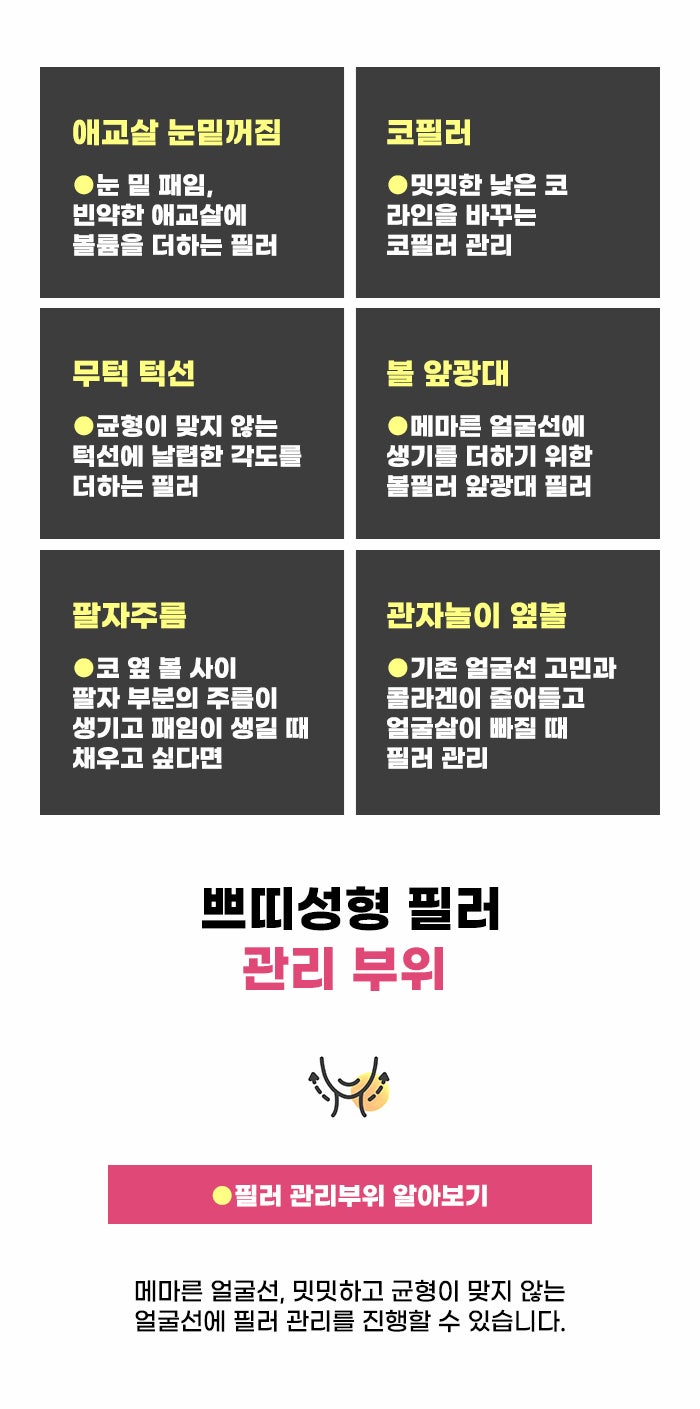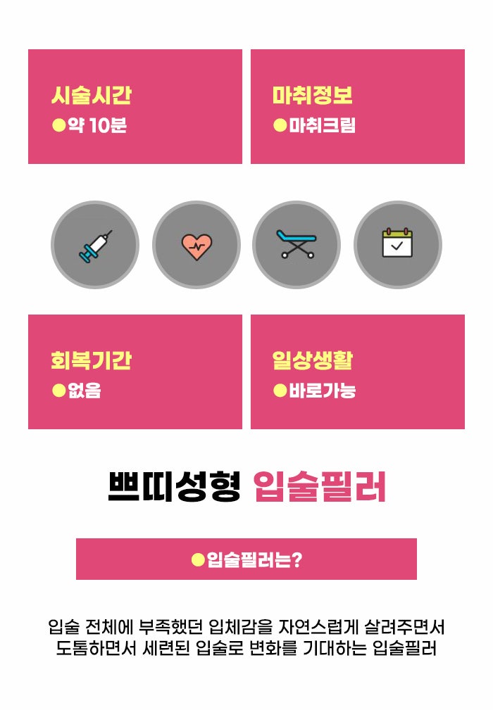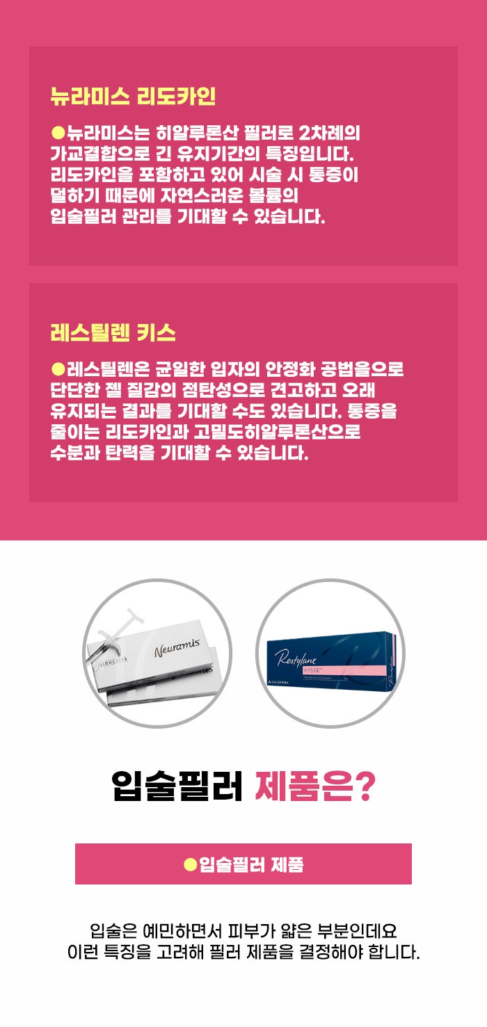 입술필러 관리만이 아니라, 얼굴의 다른 부분에 필러 관리를 진행하고 싶은 경우도 있을 것 같습니다. 개인에 따라서 옆 볼, 이마, 코필러 그리고 애교살 필러 등 필요한 부분에 볼륨을 더하고 생기 있는 이미지를 찾을 수도 있다고 하는데요, 또한 필요한 경우 다른 쁘띠성형, 리프팅과 함께 진행할 수 있는지도 확인하셨으면 합니다.
