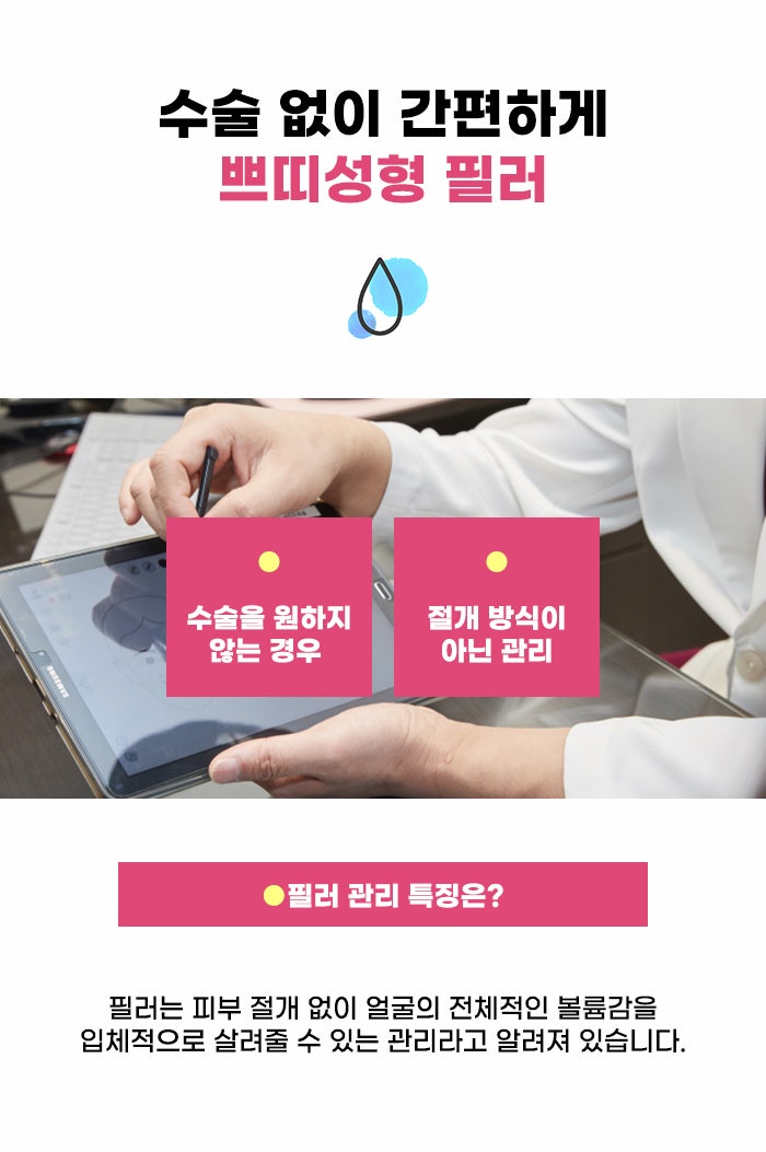 아무래도 큰 수술의 경우에는 이후의 부담에 대해서도 고민이 클 수 있습니다. 또한 수술 과정에서의 부담도 있는데요, 마취에 대한 고민도 있을 수 있고 통증에 대한 고민, 회복기간에 대한 고민도 생길 수 있습니다. 그렇다 보니 장점이 있어도 수술을 원하지 않는 분도 있고, 수술을 원하지만 망설이는 분도 있을 것 같습니다. 이럴 때 절개를 하지 않는 쁘띠성형 필러는 원하는 변화를 가져다주면서도 부담을 줄이는 방법이 될 것 같습니다.