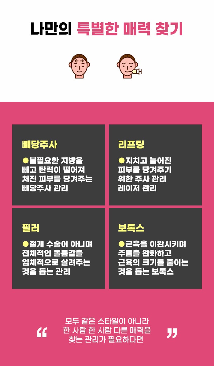 아름다움을 위해 성형수술을 결정하는 분이 많습니다. 갖고 있는 콤플렉스, 바꾸고 싶은 부분을 바꾸기 위해, 그리고 자신이 원하는 이미지에 다가가기 위해서 성형수술을 찾고는 합니다. 그런데 절개를 하거나 뼈를 줄이는 방식, 얼굴선을 바꾸기 위해 단단한 보형물을 고정하는 방식 등의 성형 수술은 매력적인 부분도 있지만 주의해야 할 점도 있는데요.