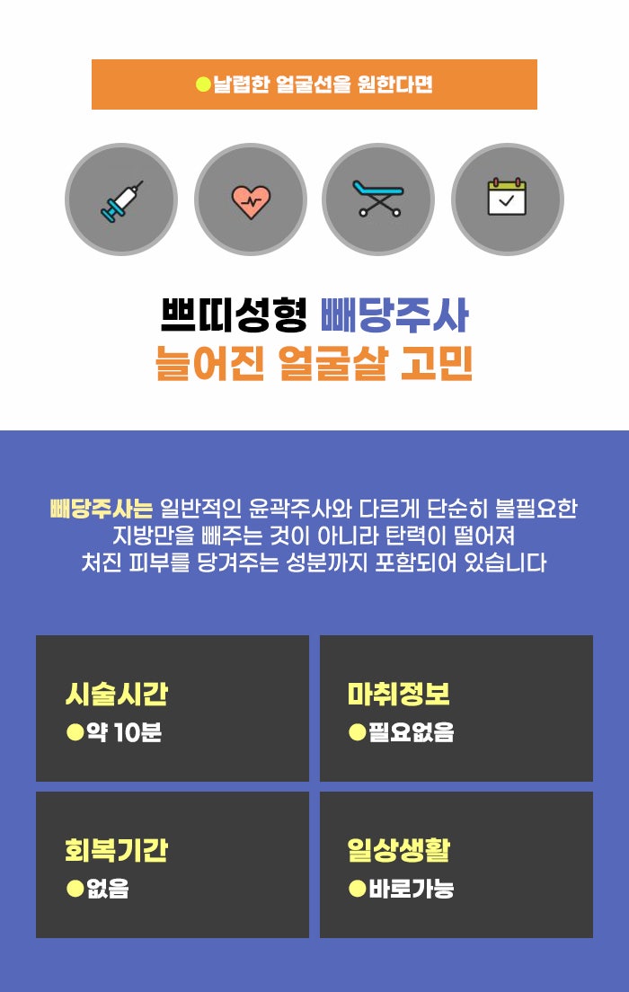 강남 리프팅주사 관리를 알아보는 분 중, 얼굴 살을 빼고 싶고, 얼굴 라인을 당기고 싶다면 주목할 만한 관리로 빼당주사가 있습니다. 빼당주사는 얼굴의 불필요하게 많은 지방을 줄이는 것을 도우면서 리프팅도 돕는 성분을 이용한다고 하는데요. 얼굴에 살이 많은 분인 경우 처짐이 생기면서 갑자기 얼굴 살이 더 처지고 늘어지며 노안이 되기도 합니다.