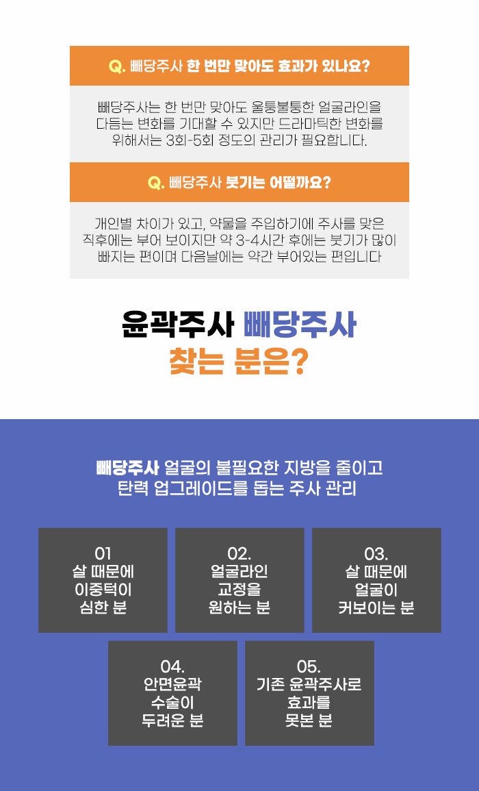 이럴 때 그냥 리프팅 관리만을 하는 게 아니라, 얼굴에 너무 많은 살을 줄여주는 것을 원할 수도 있는데요. 늘어진 턱선이나 이중턱의 경우에는 지방이 많이 겹치는 선이 생기는 것도 문제가 됩니다. 이럴 때 빼당주사는 마취를 하지 않고 진행할 정도로 통증 부담이 적은 관리이면서, 날렵한 얼굴선을 만드는 데 도움을 기대할 수도 있습니다.