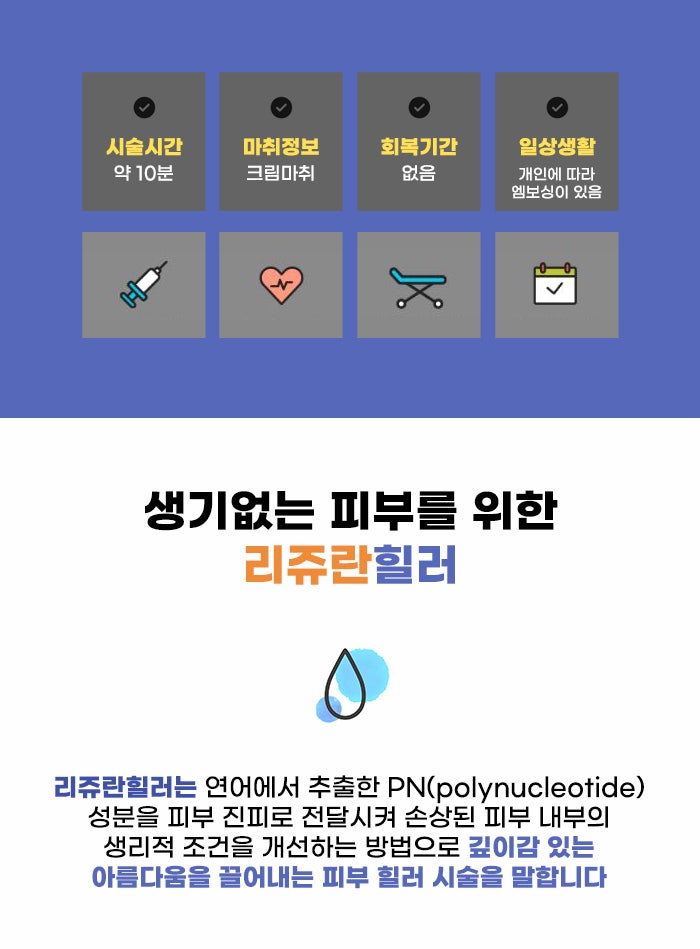 주름, 처짐 등에 대해서 고민을 갖고 있는 분의 경우, 피부 장벽이 무너지고, 피부가 건조하고 지쳤을 때 지친 피부를 살펴주는 관리에 대해서도 알고 싶을 수 있는데요. 특히 피부 장벽 강화가 필요한 분이라면 주목할 만한 관리로 리쥬란힐러 관리가 있다고 합니다. 피부 노화 고민을 변화시키기 위한 여러 관리를 알아봤는데요, 모든 사람의 얼굴 특징과 피부 특징이 같은 것이 아니기에, 나의 상황에 맞는 관리를 찾을 수 있었으면 합니다!