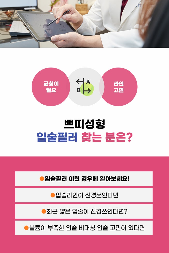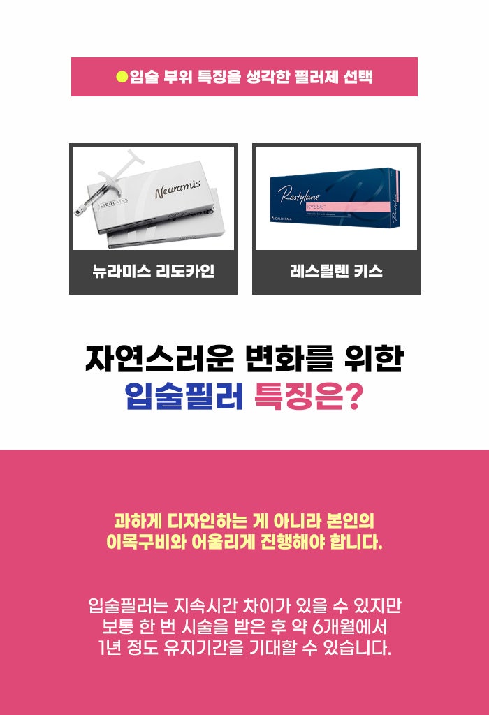 그렇기에 애교살 필러 관리를 통해 눈 밑에 볼륨을 더해주고 전체적으로 더 화려한 인상을 갖길 원하기도 합니다. 특히 애교살이 있을 경우 꺼진 중안부, 긴 중안부 얼굴형을 약간 커버하는 것도 기대할 수 있기도 합니다. 강남 입술필러 추천 정보 찾는 분의 경우 입술이 얇은 게 고민이었던 분이 많을 것 같습니다. 특히 도톰한 입술이 트렌드이다 보니 기존에 입술이 얇았던 분이 더욱 스트레스를 받기도 합니다.