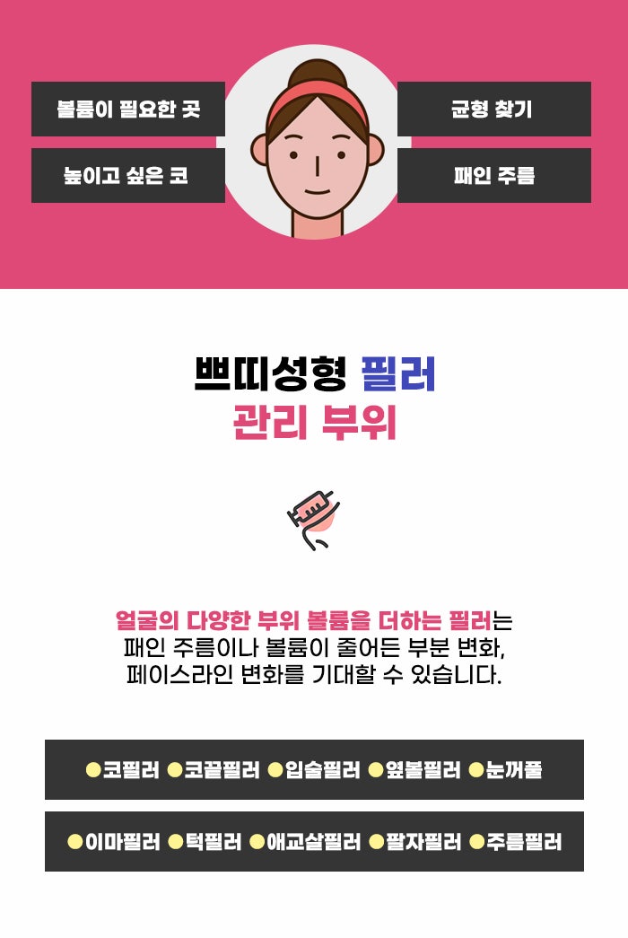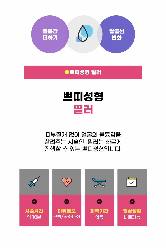 필러는 쁘띠성형 관리 중 주사 방식인데요, 절개를 하거나 단단한 인공 보형물을 삽입하는 방식이 아닙니다. 필러 관리는 주사 방식이다 보니 절개 흉터, 자국에 대한 걱정을 할 필요가 없는 편입니다. 그렇다 보니 절개 과정에서 따르는 긴 회복 기간, 통증에 대한 고민도 줄어드는데요, 관리를 진행하고 난 후에 오랜 시간 동안 기다려야 변화를 느낄 수 있는 게 아니라 즉각적인 차이를 기대할 수도 있다는 점이 필러의 장점인 것 같습니다.
