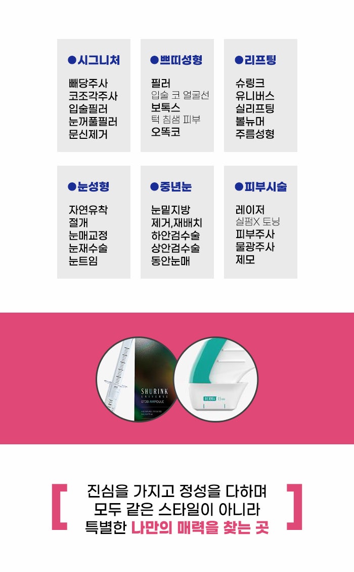 지금 내 얼굴에서 단점을 보완하고 싶을 때나, 콤플렉스를 바꾸고 자신감을 찾고 싶을 때 성형에 대해서 알아볼 수 있습니다. 특히 요즘은 메이크업이나 성형, 미용 방법을 원래 갖고 있었던 단점을 변화시키기 위해서만 찾는 것은 아닙니다. 개인이 갖고 있는 개성을 드러내고, 원하는 이미지를 추구하기 위한 방법을 찾고 싶어 하는 분도 많은 것 같습니다.