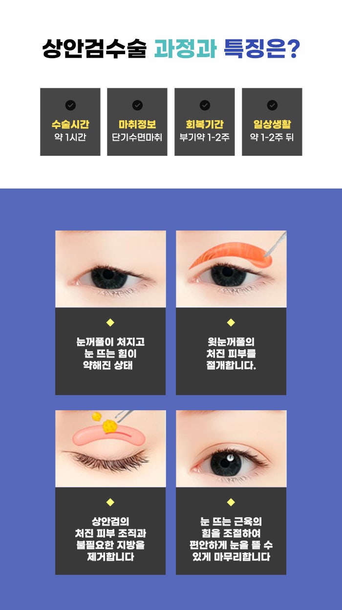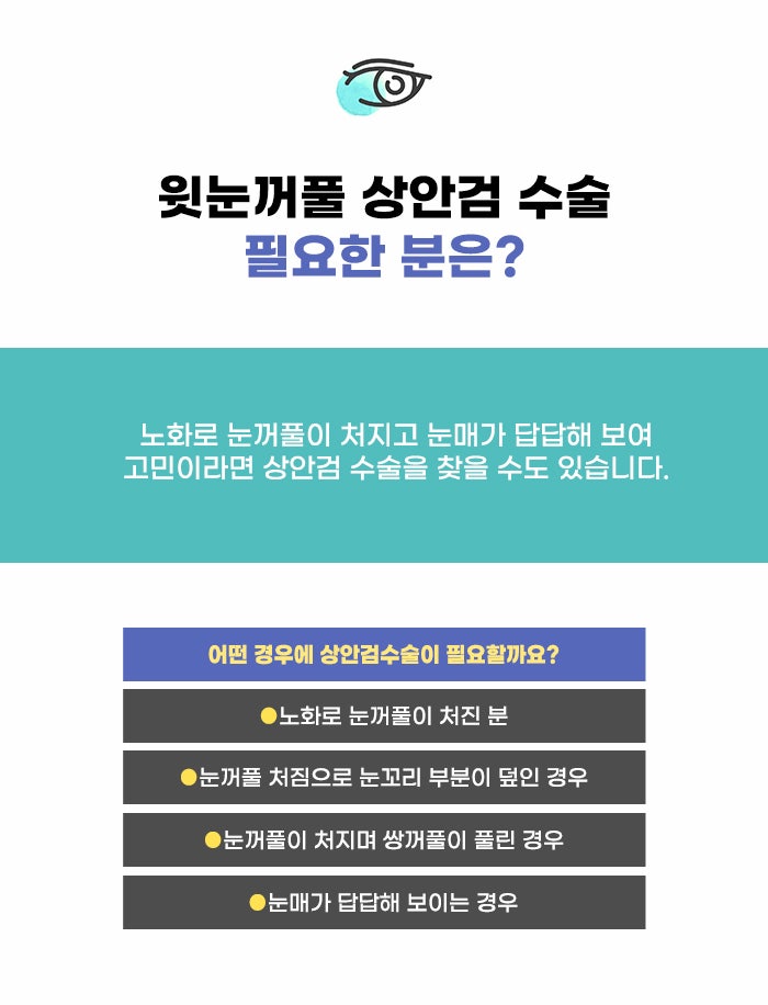 이런 이유로 눈꺼풀 처짐이 심해지면서 눈 짓무름이 생기고 눈 위생 관리에 어려움을 겪는 경우도 있다고 합니다. 다양한 이유로 강남 상안검 잘하는곳 알아보고 싶을 수 있는데요, 선명한 동안 눈매를 찾고 싶어서 강남 상안검 잘하는곳 정보 찾고 있다면 이 페이지를 통해서 상안검 수술에 대해서 정보를 얻을 수 있었으면 합니다.