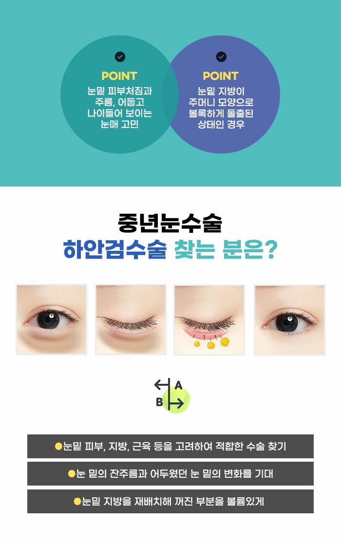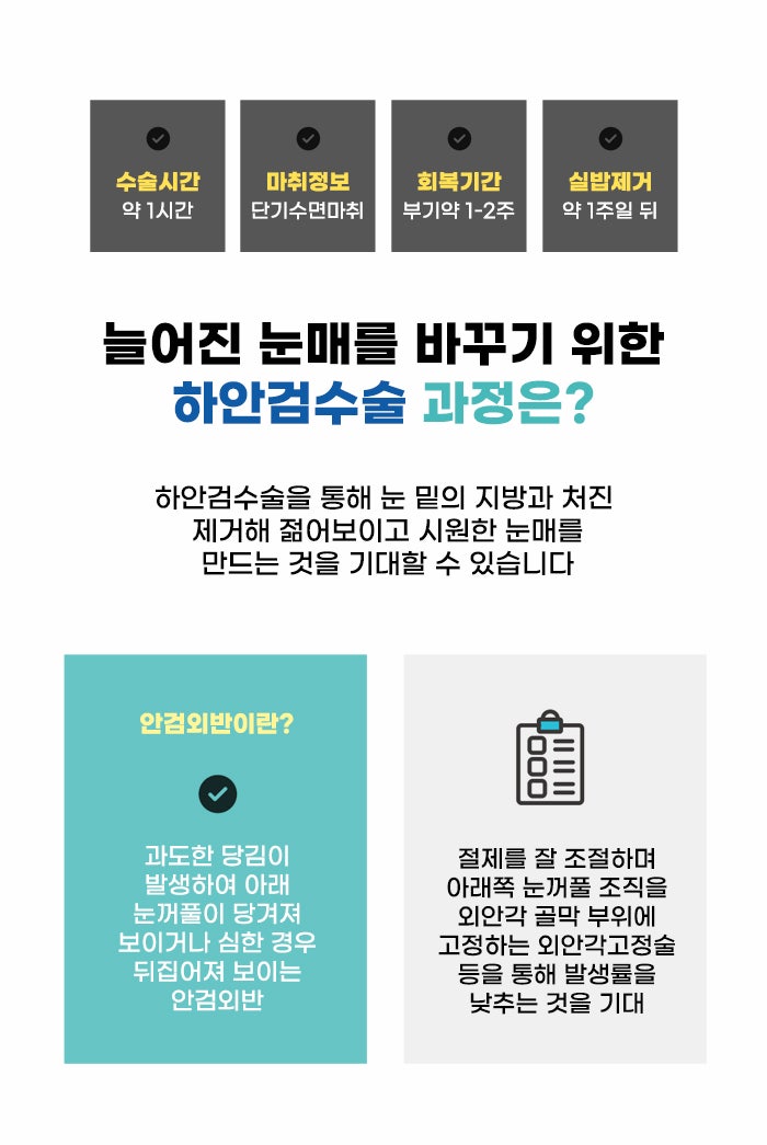 윗눈꺼풀이 늘어지는 게 고민되는 경우도 있지만, 눈 아랫부분의 피부 늘어짐이나 지방 늘어짐, 패임 등이 스트레스가 되는 경우도 있습니다. 이런 경우 불필요한 조직을 절개하고 봉합하거나, 필요하지 않은 지방 제거, 패인 부분을 채워주는 눈밑지방재배치 등을 결정하기도 하는데요, 안검외반 방지를 기대하는 외안각 고정술 등과 같은 노하우를 가진 곳인지 확인하고 나에게 맞는 방법을 찾길 바랍니다.