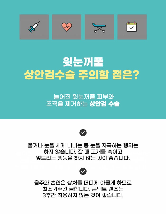 상안검 수술은 간단하게 생각될 수도 있지만 얼굴, 그것도 예민한 눈 부분에 진행되는 과정인 만큼 간단하게만 생각해서는 안 되는 과정이기도 합니다. 또한 나의 상황에 강남 상안검 잘하는곳 필요한 것인지, 혹은 다른 관리가 더 필요한 것은 아닌지 확인해 보는 것도 중요할 수 있다고 합니다. 관리를 진행한 후에 주의해야 할 점에 대해서 알고 잘 지키는 것도 필요한데요. 상처를 더디게 아물게 하는 음주, 흡연은 최소 4주간 금해야 한다고 합니다.