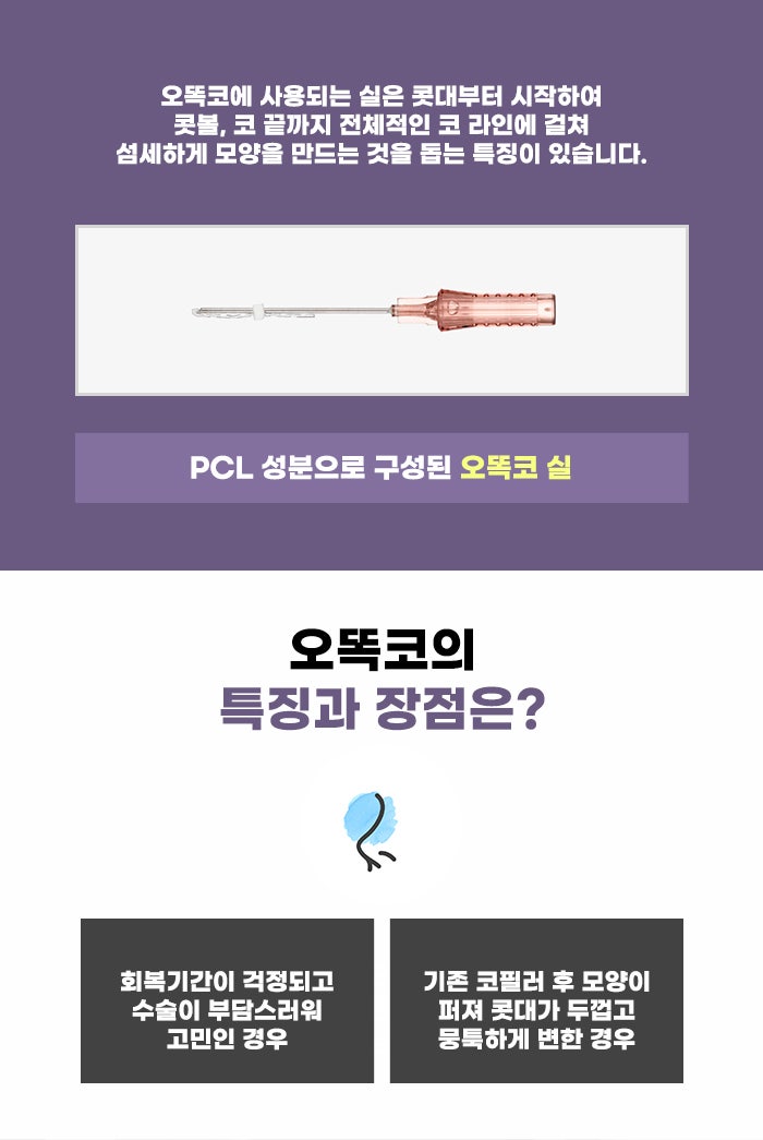 오똑코 관리는 회복 기간이 걱정되고 수술을 하는 것은 부담스러운 분도 찾고 있는 것 같은데요. 또한 큰 수술이 아니라 현재 내가 갖고 있는 코 모양과 개성을 드러내면서, 단점을 보완하고 싶은 경우에도 찾을 수도 있다고 합니다. 오똑코에 사용되는 실은 PCL 성분을 이용한다고 하는데요, 이 PCL 성분을 통해 콜라겐 합성 유도를 기대할 수도 있다고 합니다.