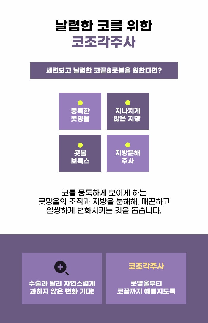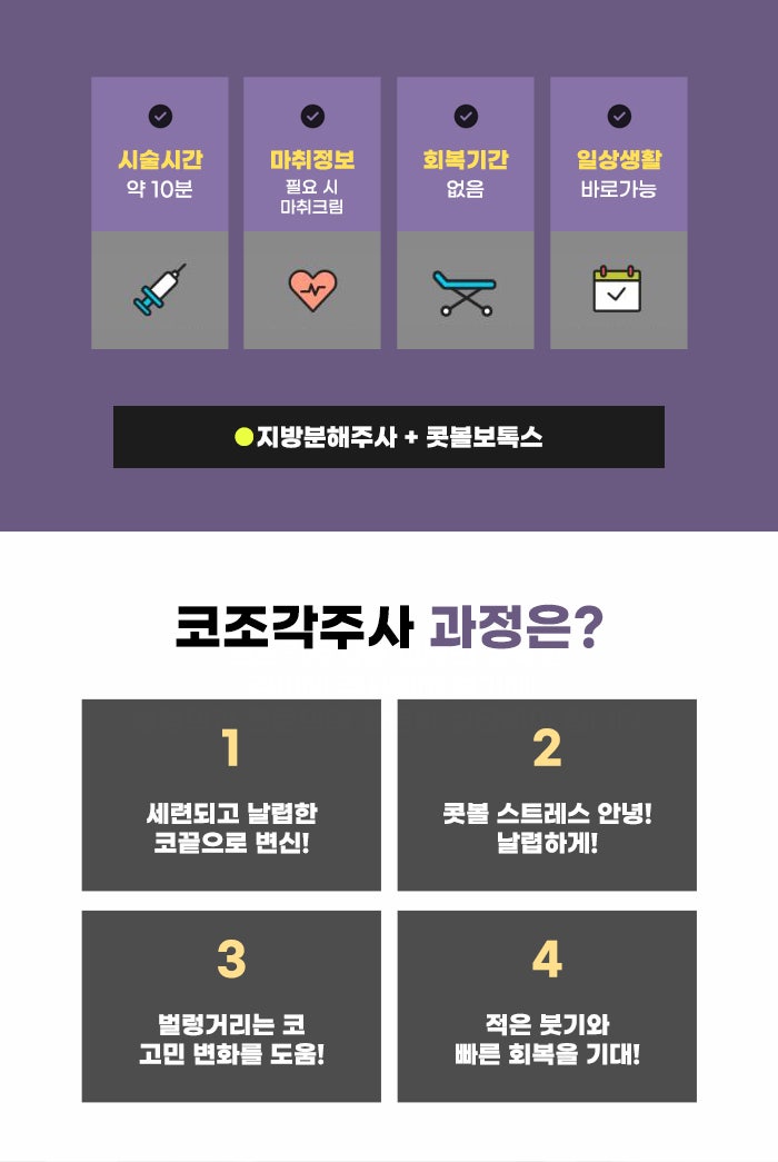 그런데 이런 방식은 코 모양을 크게 바꿀 수도 있고, 지금 갖고 있는 코 모양에서 드라마틱한 변화를 만들 수도 있다는 특징이 있기는 합니다. 하지만 이런 장점도 크지만 모든 분이 코성형수술을 결정할 수 있는 상황에 있는 것은 아닌데요. 절개 방식이나 단단한 보형물을 넣는 성형 수술에 대해 부담을 느끼는 경우도 있습니다. 이럴 때 코조각주사 관리, 지방분해와 콧볼 보톡스를 이용하는 방식이 궁금할 수도 있다고 합니다.