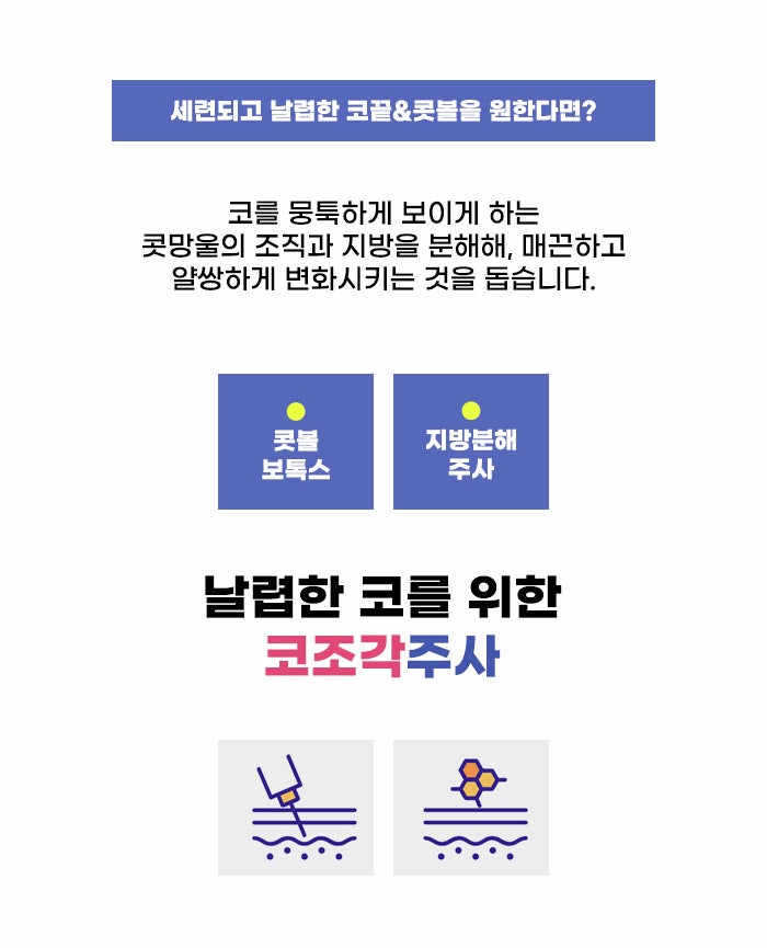 코조각주사는 주사 관리이며 절개 방식이 아니라고 합니다. 그렇다 보니 신논현성형외과 수술 등 절개를 원치 않는 분도 이 관리에 대해서 더 쉽게 접근할 수도 있는 것 같습니다. 콧볼 보톡스 그리고 지방분해 주사를 이용하는 방법이라고 하는데요. 넓어 보이는 콧볼, 코를 더 둔하고 뭉툭해 보이도록 하는 콧망울의 너무 많은 조직, 지방을 분해하는 걸 기대할 수 있다고 합니다.