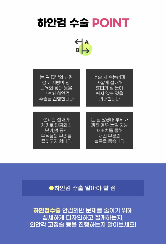 그리고 눈 밑의 처진 피부와 늘어진 조직을 잘라내는 게 하안검 수술이라면 눈 윗꺼풀에도 이런 고민이 생길 수 있는데요. 불필요하게 늘어지고 눈꼬리를 가릴 수 있는 눈꺼풀을 절제하는 게 상안검 수술이라고 합니다. 눈꺼풀이 너무 처지고 늘어질 경우에는 나이 들어 보이기도 하고 시야를 가리기도 하며, 눈 짓무름 등의 문제가 발생할 가능성도 있다고 하는데요. 현재 내 눈의 형태, 특징, 고민을 고려해 올바른 결정을 내릴 수 있었으면 합니다.