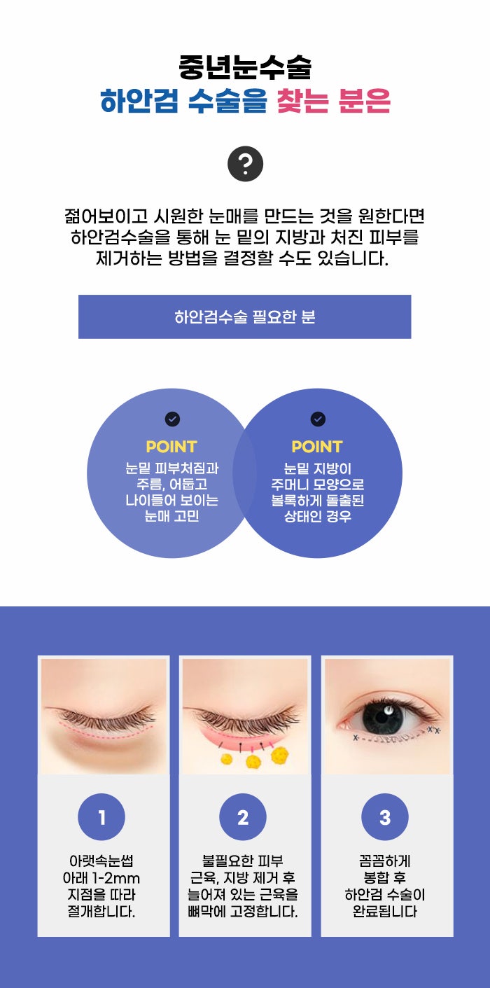 중년의 연령이 되면서 노화가 뚜렷하게 드러날 수 있는데요. 하안검 수술이 고민되는 때가 중년 시기라고 합니다. 노화가 진행되면서 눈 밑의 지방이 늘어지고 피부도 늘어지며 불룩하게 튀어나와 보일 수 있습니다. 그리고 눈 밑의 주름이 뚜렷해 보일 수 있는데요. 이럴 때 강남역하안검 방법을 알아볼 수도 있다고 합니다.