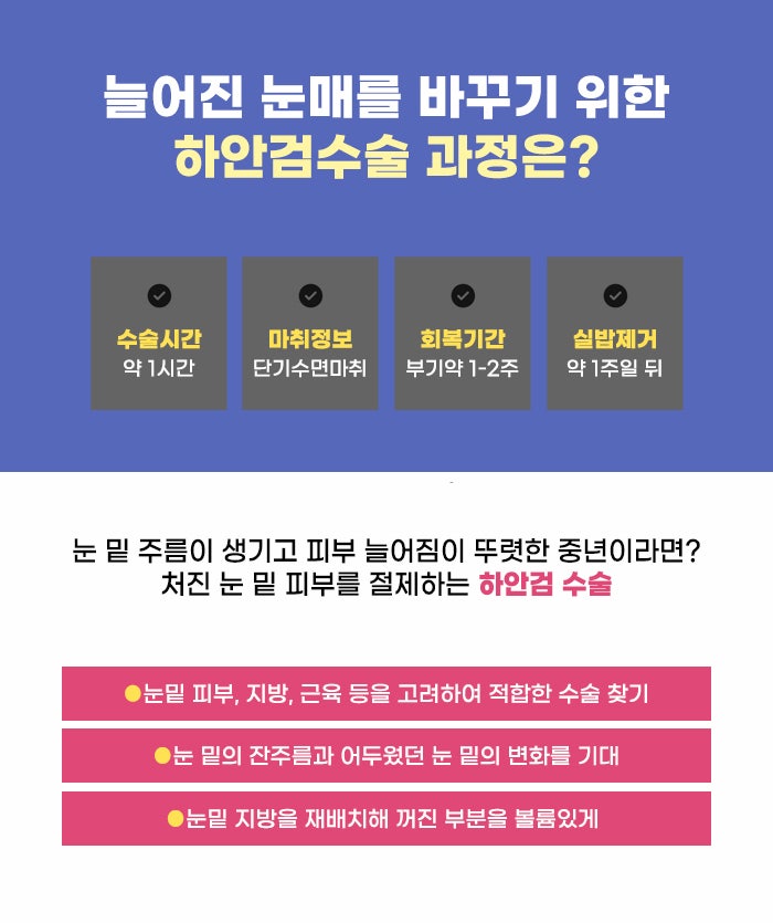 눈 밑 피부 처짐, 주름이 생긴 경우 진행하는 강남역하안검 수술은 어떤 관리일까요? 하안검 수술은 단기 수면마취를 통해 진행되며 수술 시간의 경우 약 1시간가량이라고 합니다. 부기, 회복 기간 그리고 세부적인 과정, 결과는 개인의 차이가 있는데요. 보통 1-2주 부기가 있는 편이라고 하며 봉합 후 실밥 제거는 1주일 뒤라고 합니다.