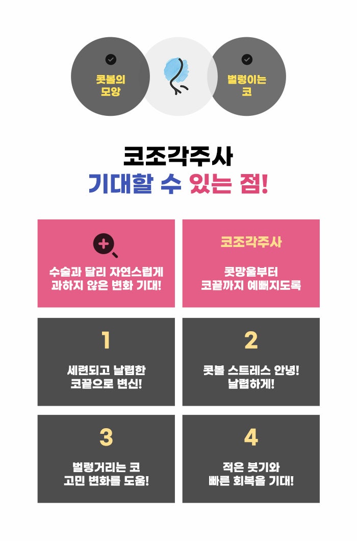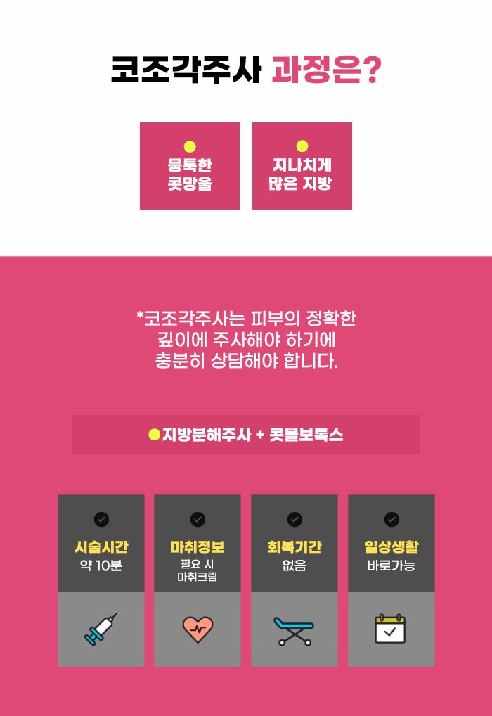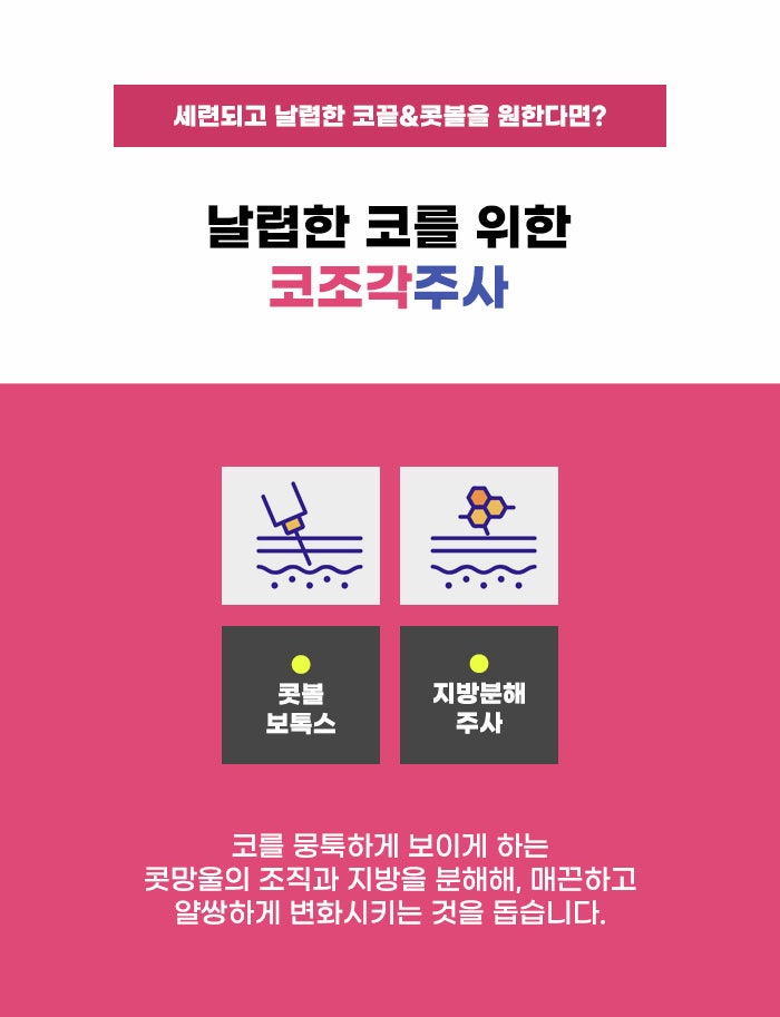 마취나 절개 방식이 걱정된다는 분도 있고, 절개 방식과 보형물을 삽입하는 방식의 코성형수술이 부담된다는 분도 있습니다. 성형에 대해서 궁금하지만 오래 휴가를 내기 어려운 직장인, 바쁜 분도 있는데요. 절개, 보형물 삽입 방식으로 진행되는 성형의 경우에도 드라마틱한 변화, 더 큰 차이를 만들 수도 있다는 장점이 있습니다. 하지만 모든 분이 이런 수술 방식을 결정할 수 없는 만큼 좀 더 부담이 적은 방법이면서 자연스러운 변화를 기대할 수 있는 방법이 있는데요. 바로 코조각주사라고 합니다.