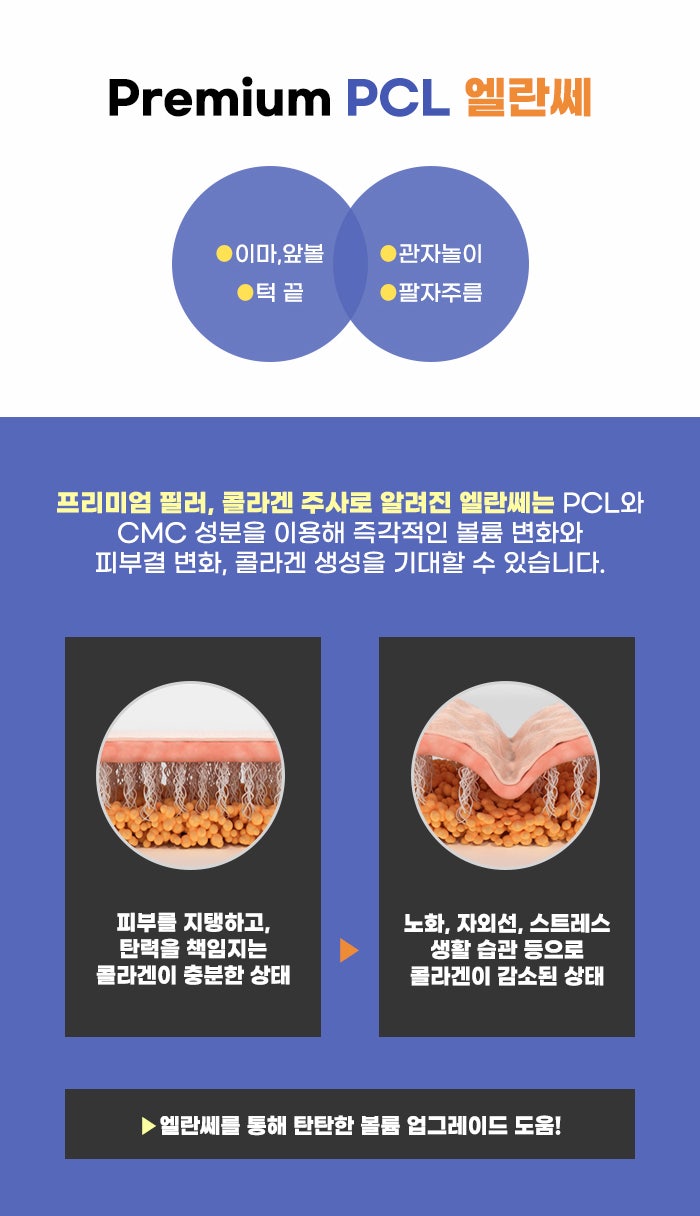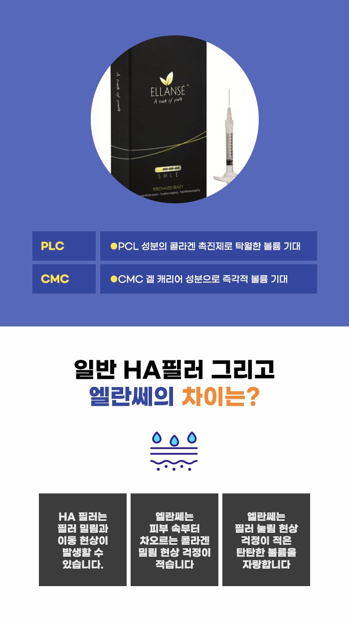 보통 필러 관리 같은 경우 즉각적인 차이를 만들지만, 이후에 점점 볼륨이 줄어드는 게 흔합니다. 하지만 엘란쎄의 경우에는 PCL CMC 성분을 이용합니다. 즉각적으로 볼륨을 형성하는 것과 함께, 자가 콜라겐 합성을 돕는다고 합니다. 이런 특성을 통해서 자연스러우면서 더 오래가는 엘란쎄 옆볼필러 볼륨을 기대할 수도 있다고 합니다.