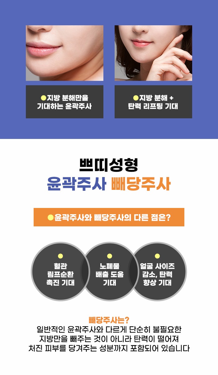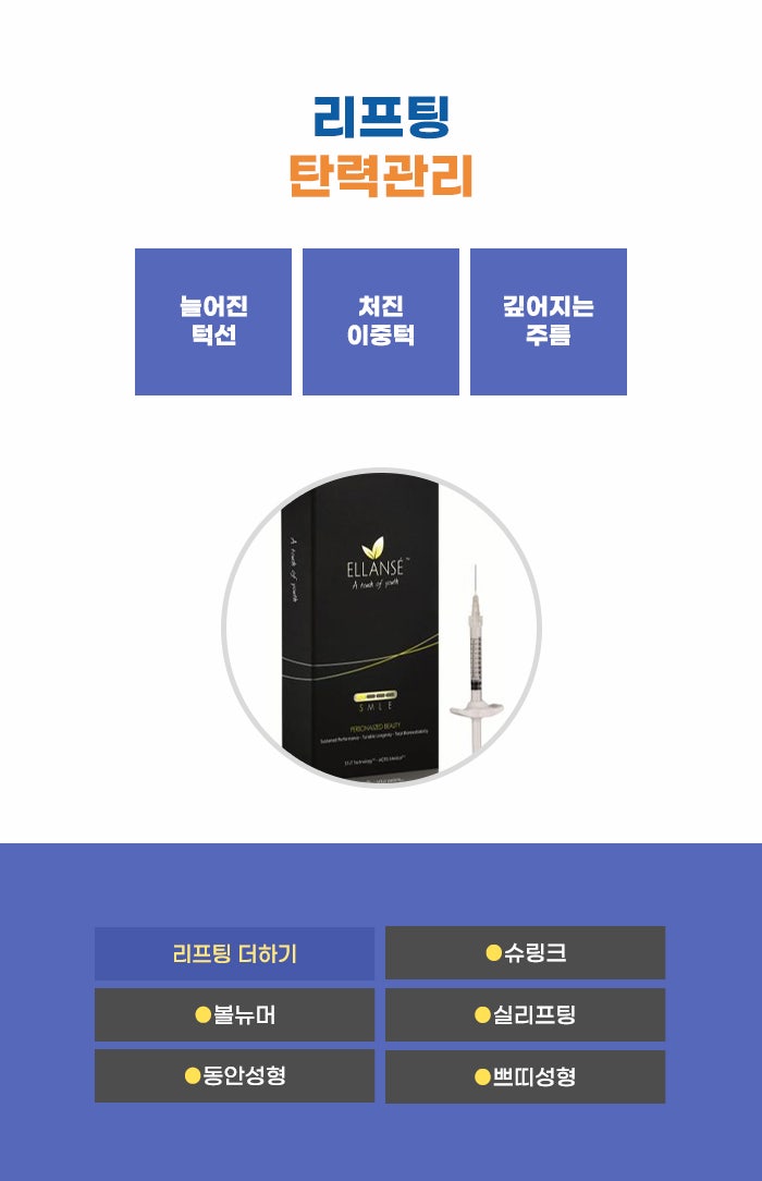 볼살 처짐, 턱살 처짐 등이 생기면서 볼륨이 필요한 곳에는 볼륨이 너무 적고, 볼륨이 필요하지 않은 곳에는 볼륨이 너무 많은 고민이 생기기도 합니다. 라인 변화가 필요한 상태, 리프팅도 필요한 상태라면 탄력과 볼륨을 더하는 엘란쎄. 그리고 불필요한 지방 분해를 돕는 빼당주사 등 여러 관리의 장점을 체크하길 바랍니다.