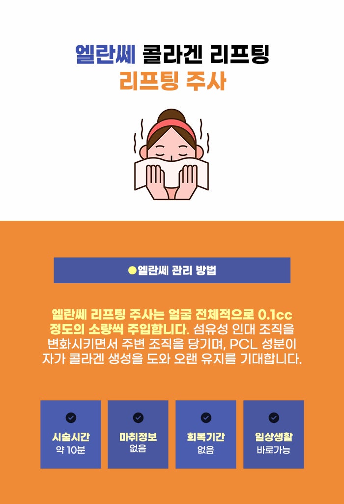 수술을 하지 않으면서 더 뚜렷한 리프팅 차이를 기대할 수 있다는 점에서 실리프팅에 대해서 관심을 갖는 분도 많은데요. 다만 일반적으로 엘란쎄 리프팅 주사 관리에 비해 실리프팅은 국소마취를 하고 진행되며 관리 시간은 약 30분 정도라고 합니다. 시간이 오래 걸리고 마취에 대한 걱정, 통증에 대한 걱정도 있을 수 있다고 하는데요. 그러나 엘란쎄는 이런 점에 대한 상대적으로 적은 편이라고 생각됩니다.