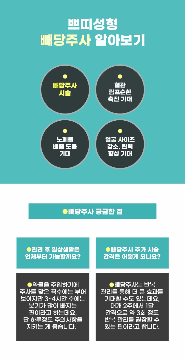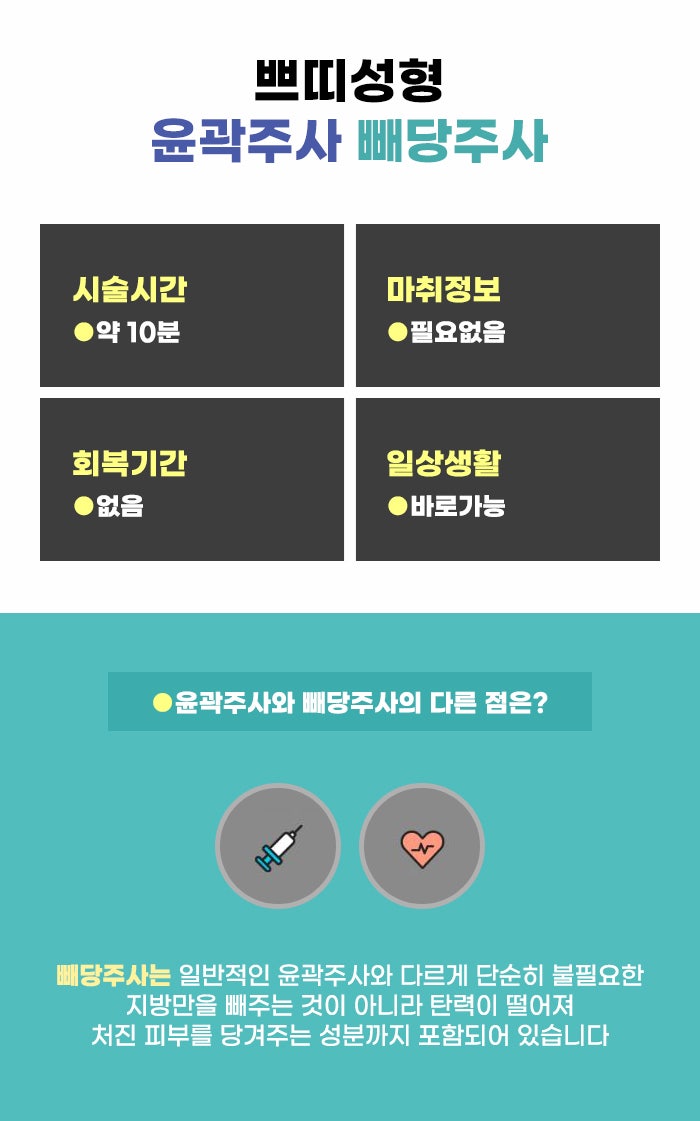 빼당주사 관리 같은 경우 걱정할 수도 있는 점이 있는데요. 스테로이드 성분, 히알루로니다제 성분을 포함하고 있는지 궁금할 수도 있습니다. 일반적인 윤곽주사에 이 성분이 포함되어 있을 수 있기 때문인데요. 하지만 빼당주사는 스테로이드나 히알루로니다제를 이용하지 않는 것이기에 이 성분에 대한 걱정을 줄일 수 있습니다.