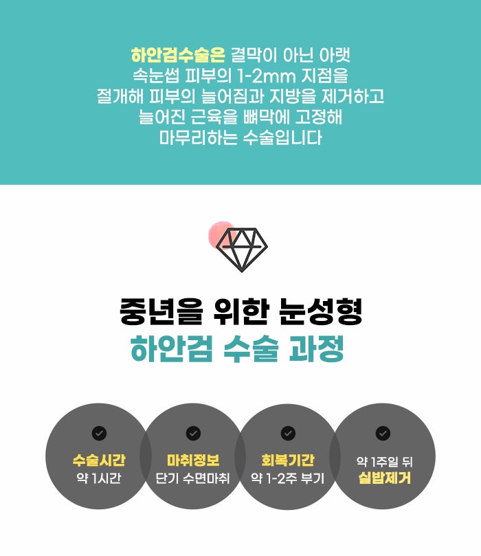 강남역 중년눈수술 추천 알아보는 분 중에 눈 밑의 피부 늘어짐, 볼록한 피부가 고민인 분의 경우 하안검 수술에 대해서도 알고 싶을 수 있겠습니다. 하안검 수술은 눈 밑의 주름이 깊어지거나, 피부가 늘어져 보일 때, 불필요한 피부, 조직을 절제하고 제거하는 수술이라고 하는데요. 일반적으로 단기 수면마취를 하고 진행하는 편이라고 합니다.