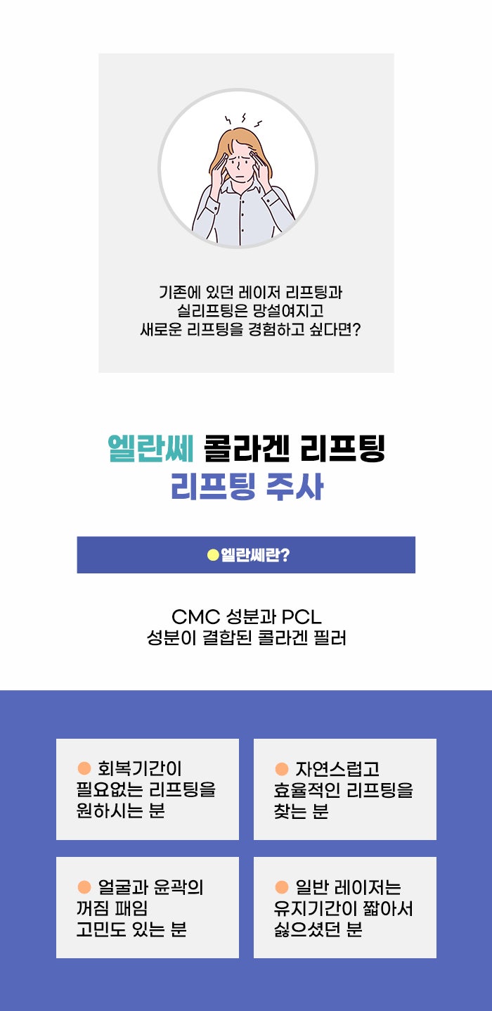 하지만 사실 수술은 모든 사람이 결정할 수 있는 것은 아닙니다. 그리고 다양한 이유로 빠르게 리프팅 수술을 선택하는 경우도 있지만, 일반적으로 중년 이후의 연령에서 리프팅 관련 수술을 결정하는 분이 더 많은 것 같습니다. 평소 강한 자극, 절개 등의 걱정이 없으면서, 쉽게 진행할 수 있는 리프팅 관리를 하며 탄력을 지키고 싶어 하는 분이 많은 것 같은데요. 자가 콜라겐 생성을 돕는 엘란쎄 리프팅 관리는 많은 분이 주목하는 리프팅 탄력 관리입니다.