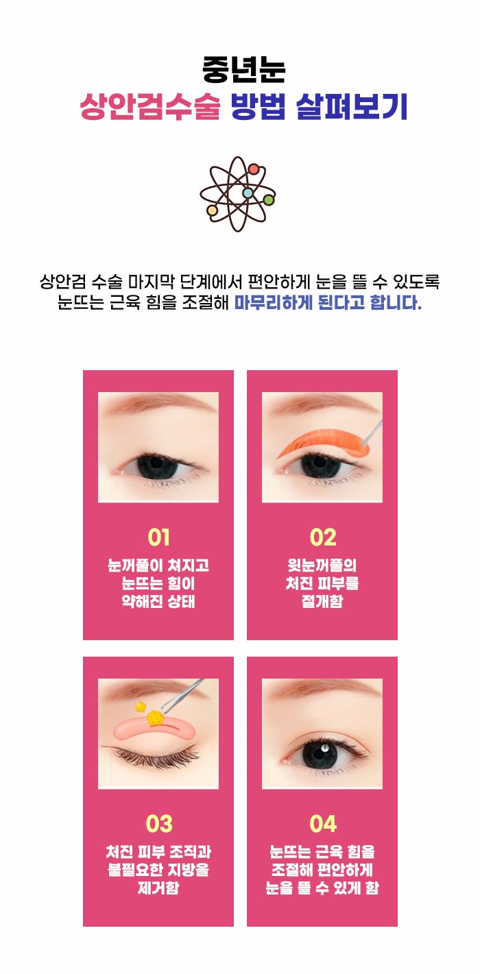 특히 중년에는 피부 탄력 저하, 주름 등이 본격적으로 드러나게 되는데요. 이런 이유로 윗눈꺼풀 피부의 늘어짐, 눈매 주름 등을 없애기 위한 중년눈수술 정보를 찾고 싶어 하는 분, 강남 상안검 잘하는곳 알아보는 분도 상당한 것 같습니다. 이 페이지를 통해 상안검 수술이나 하안검 수술, 그리고 눈밑지방제거와 재배치 등의 방법에 대한 정보를 알 수 있었으면 합니다.