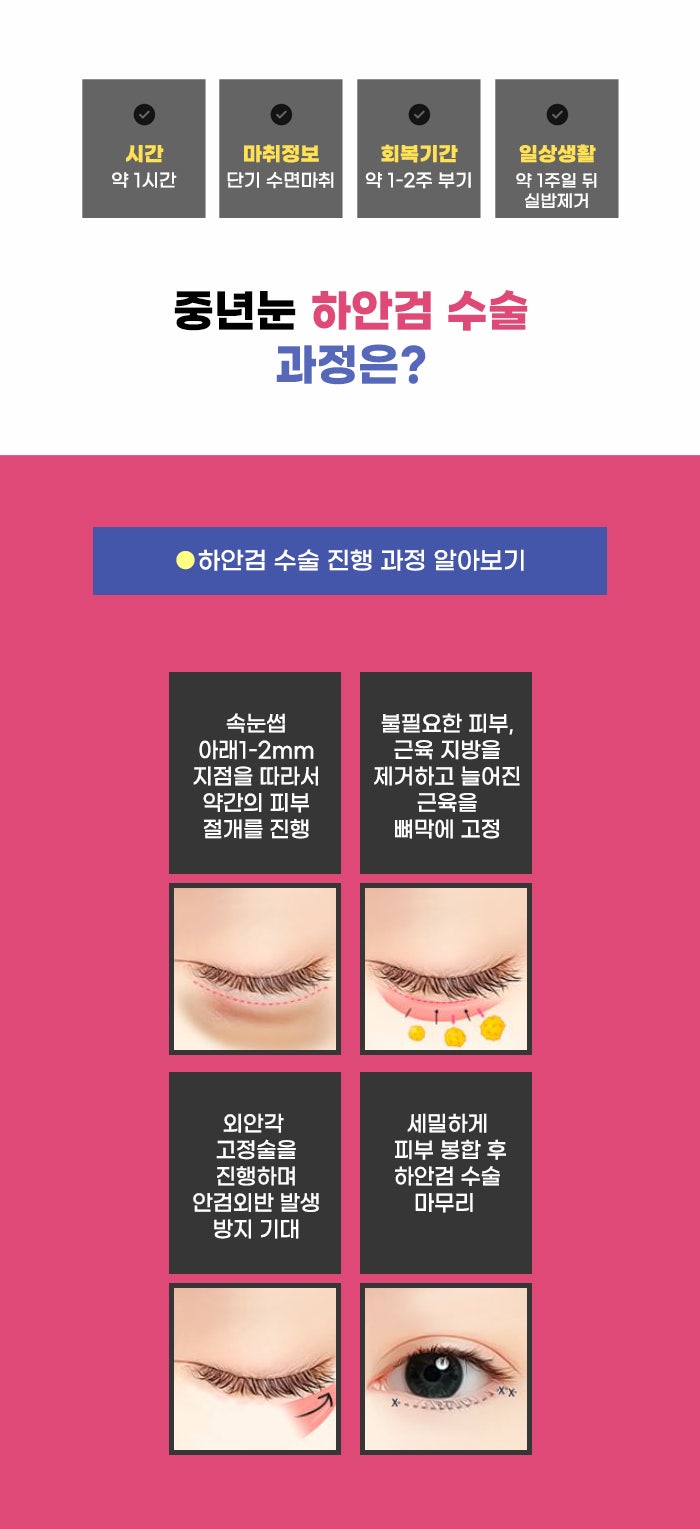 강남 상안검 잘하는곳 찾는 분의 경우 다양한 눈매 고민을 함께 갖고 있을 수도 있는데요. 눈꺼풀이 늘어진 경우 선택하는 게 상안검 수술이라면, 눈 밑의 피부가 늘어지고 처질 때, 주름이 생길 때 선택하는 게 하안검 수술이라고 합니다. 하안검 수술은 눈 밑의 늘어진 피부를 절개하며, 필요한 경우 눈 밑의 지방재배치를 진행하기도 하는데요. 동안 눈매를 찾기 위한 중년 눈수술이 궁금하다면 여러 정보를 충분히 체크하셨으면 합니다.