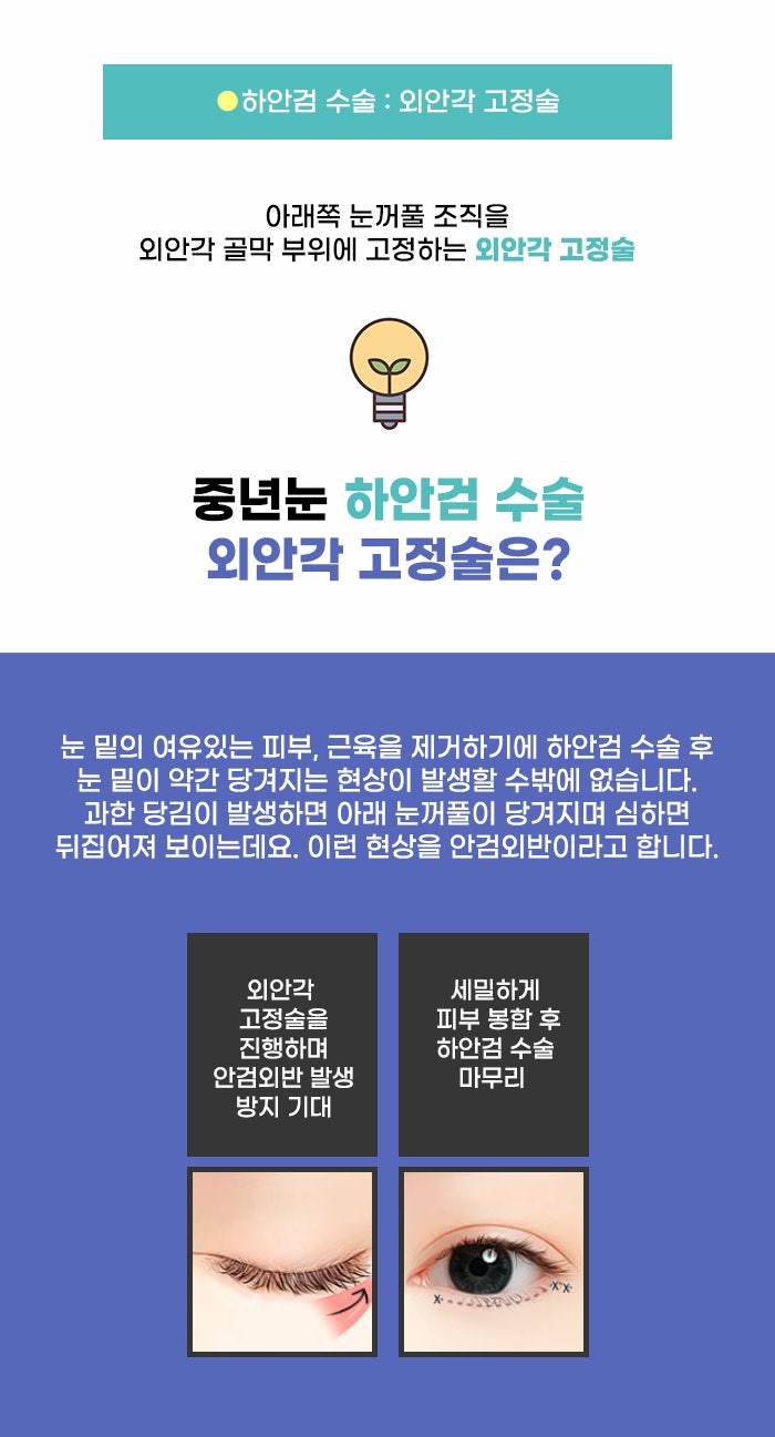 이렇게 불필요한 조직을 절제하는 만큼 약간의 당김이 느껴질 수도 있습니다. 하지만 약간의 당김이 있고 자연스럽게 시간이 지나면서 사라진다면 따로 교정은 필요하지 않은데요. 그러나 지나치게 당김이 강하고 눈 밑의 눈꺼풀이 뒤집히는 안검외반이 생긴다면 교정을 알아봐야 할 수도 있습니다. 그렇기에 외안각고정술 등의 세밀한 노하우를 가진 곳인지 파악하고 올바른 결정을 해야 하겠습니다.