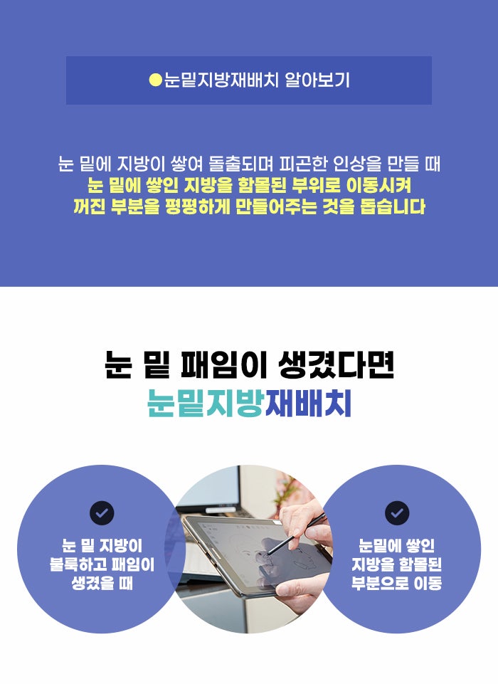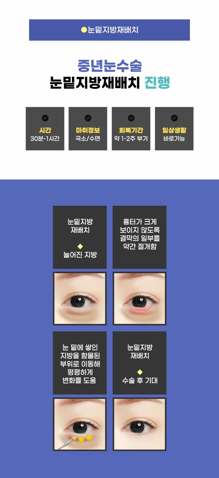 또한 눈밑지방재배치 과정을 진행한 후에 눈 밑에 주름이 생기는 건 아닐까? 피부의 여분이 축 늘어져 보이는 게 아닐까 걱정할 수도 있습니다. 기존에 피부가 이미 늘어난 상태라면, 늘어진 피부를 채우고 있었던 지방을 줄인다면 늘어져 있는 피부가 더 잘 보일 수도 있습니다. 이런 경우 처음부터 올바른 방법을 택해야 하는데요.