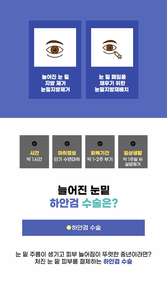 눈 밑의 지방이 늘어진 상태, 지방이 너무 많거나 혹은 부족해서 패임이 생긴 부분이 있는 상태라면 눈밑 지방 제거, 재배치를 결정하게 될 수 있는데요. 이미 피부와 불필요한 조직의 늘어짐, 눈 밑 주름이 있는 상태라면 하안검 수술을 결정할 수도 있다고 합니다. 하안검 수술은 눈 밑의 피부를 약간 절개하며 불필요한 조직을 절제하고, 외안각 고정술 등을 통해 마무리하게 된다고 하는데요.