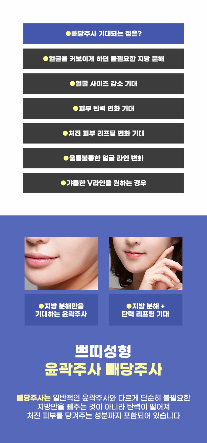 그런데 일반적인 윤곽주사 같은 경우에는 지방만을 빼는 성분을 이용하고, 또 스테로이드, 히알루로니다제 성분을 이용하는 경우가 흔한 편이라고 알려져 있습니다. 하지만 빼당주사는 다른데요. 스테로이드나 히알루로니다제 성분을 이용하지 않는다고 합니다. 또한 지방을 빼는 것만이 아니라 당겨주는 변화, 리프팅도 돕는 특징을 갖고 있다고 알려져 있습니다.