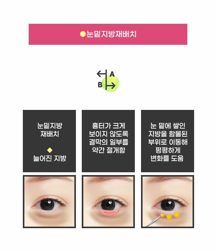 눈 밑에 이미 패임이 생긴 상태라면, 그냥 지방을 없앨 경우 함몰된 부분은 그대로고, 불룩한 지방만 없어질 수 있습니다. 그러면 울퉁불퉁한 눈매 고민은 그대로이고, 함몰된 부분을 다시 채우기 위한 다른 방법을 알아봐야 할 수도 있는데요. 이런 복합적인 고민에 변화를 기대할 수 있는 방법이 바로 눈밑지방재배치라고 합니다.
